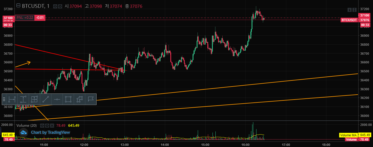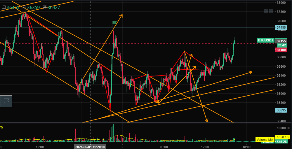 올라가더라도 37.5K의 저항을 맞고 바로 내려올 가능성이 높으며, 새벽부터 계속해서 가격이 상승했기 때문에 가격이 하락할 가능성이 크다. 즉, 내려오는 구간에서 스캘핑을 하면 많은 이익을 얻을 수 있을 거라 생각한다.