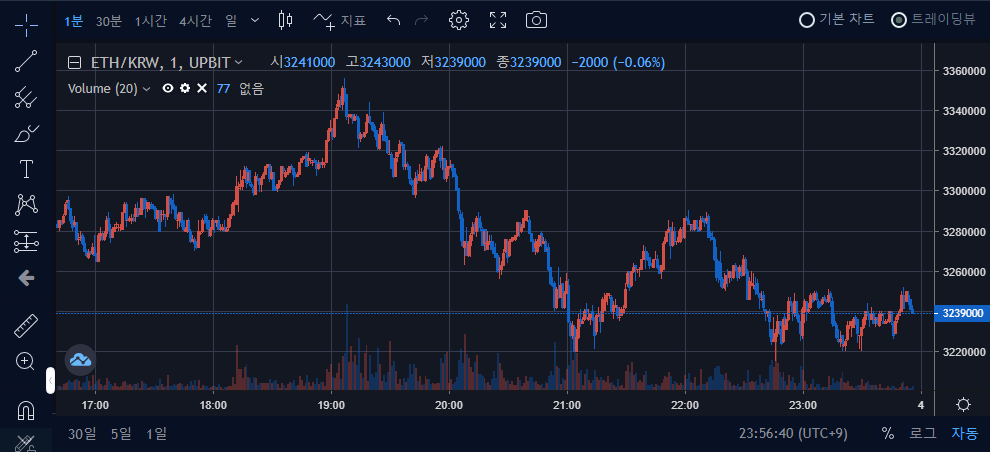 그 이유는 위와 같이 체결강도에 기간이 빠졌기 때문입니다. 위의 이더리움 차트는 1시간 봉으로 약 일주일 동안의 시세 변화를 담고 있습니다. 하지만, 1분 봉으로 반나절 또는 하루의 시세변화를 살펴본다면 확실히 가격이 하락하고 있는 것을 볼 수 있습니다.