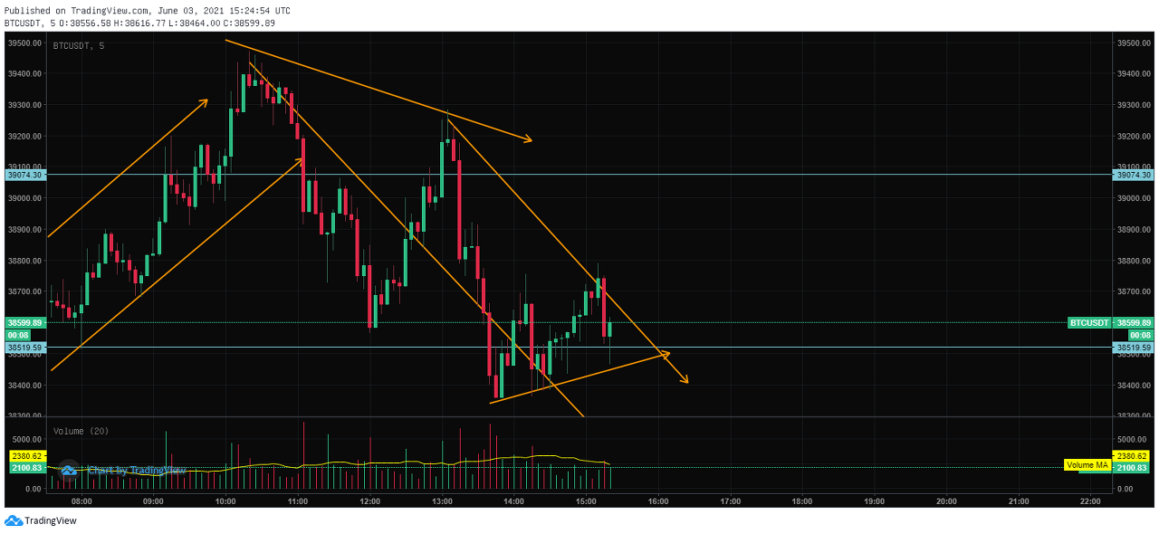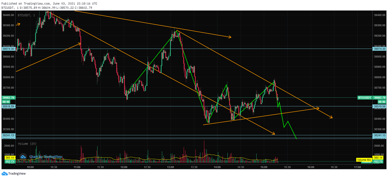 비트코인 차트 15분 봉으로 보면 비트코인은 계속해서 우상향을 하고 있다는 것을 확인할 수 있다. 6월에 들어 비트코인이 단기간 내 반등에 성공했는데, 짧은 기간 동안 상승하게 되면 한번 정도는 조정이 오거나 눌림목이 발생할 수 있기 때문이다. 즉, 이 구간을 활용한 매매법이라 할 수 있다.