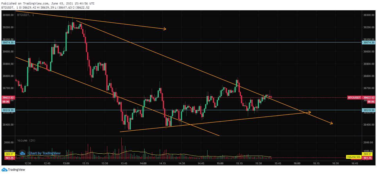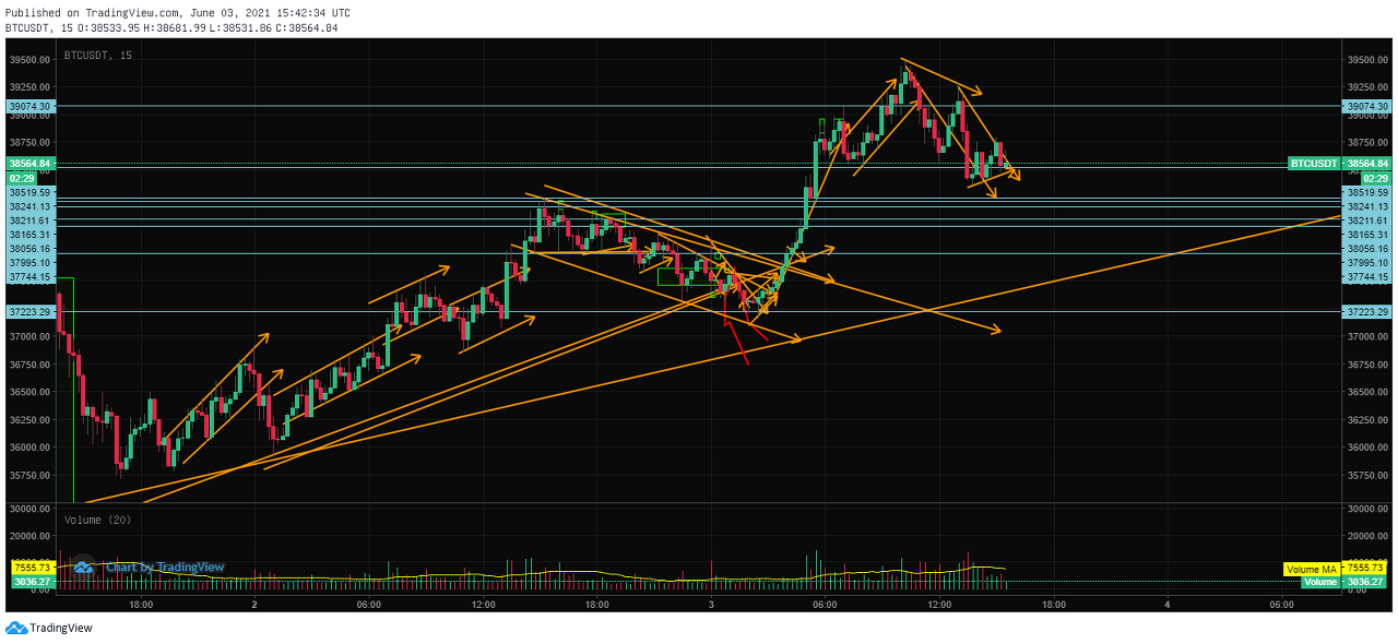 비트코인 차트 15분 봉으로 보면 비트코인은 계속해서 우상향을 하고 있다는 것을 확인할 수 있다. 6월에 들어 비트코인이 단기간 내 반등에 성공했는데, 짧은 기간 동안 상승하게 되면 한번 정도는 조정이 오거나 눌림목이 발생할 수 있기 때문이다. 즉, 이 구간을 활용한 매매법이라 할 수 있다.