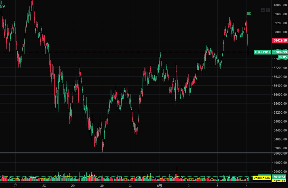 지지선이 깨지자마자 바로 숏포지션을 잡았고, 이후 급락이 나왔습니다. 33K부터 39K까지 반등했는데, 호재가 기대되지 않는 상황에서 반등하자마자 일론 머스크의 트윗이 터졌기 때문에 대부분의 트레이더들은 '관망'포지션을 잡을 가능성이 큽니다.