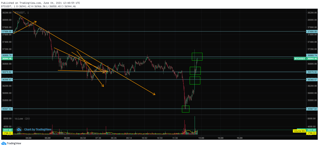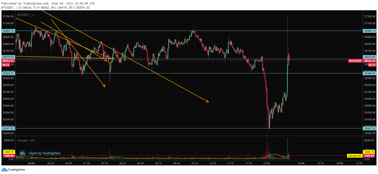 당연히 하락이 예상되기 때문에 평소보다 레버리지를 당겨서 숏 포지션을 잡는 경우가 있는데, 한 번에 1.5K를 들어 올릴 정도의 매수가 들어오면 숏포지션 대부분은 청산당한다. 반대로, 롱포지션을 잡고 있는 중에도 또 한 번의 거대 매도가 나올 가능성이 있다. 비트코인 시장에서는 흔한 일이다. 그렇다고 위와 같은 폭발적인 매수 물량이 쉽게 추세를 바꾸진 못한다.