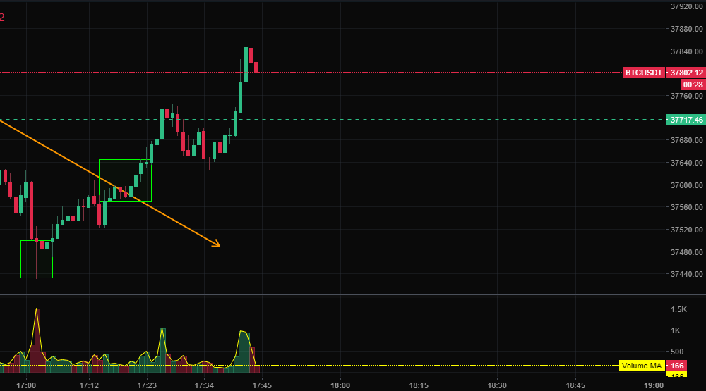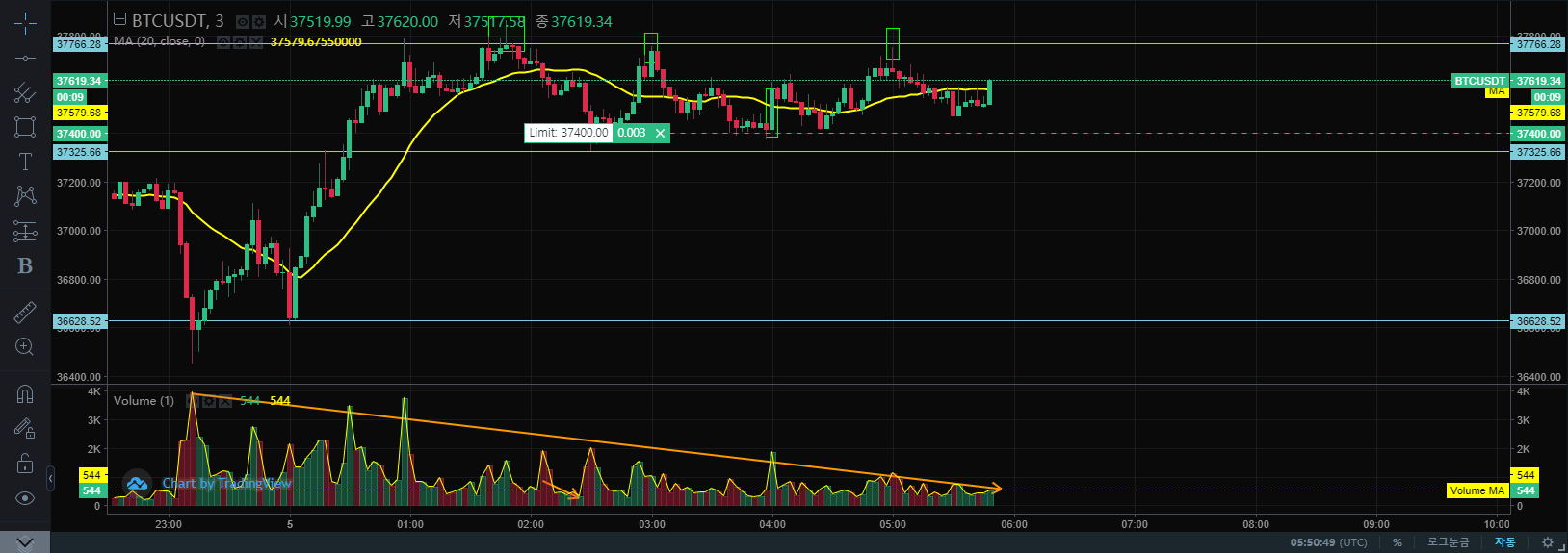 1분 봉이나 3분 봉이나 별 차이 없어 보인다. 거래량이 터지는데 중간중간 매수 주문이 들어오긴 하지만, 전체적으로 거래량은 빠지는 상황, 그런데 오히려 저점은 조금씩 높아지고 있다. 박스권에서 지지받으면서 스탑로스 걸어놓고 지지선 매수, 저항선 숏 치면 꽤나 달콤하다. 하지만, 이런 상황에서 점점 수렴하고 있기 때문에 어디로 빠져도 이상하지 않을 상항이다. 지정가 매수 걸어놓았지만 어느 순간 매도 물량 쏟아버리게 되면 세력은 차익 실현하고 사람들은 고점에 물려버릴 것이다.