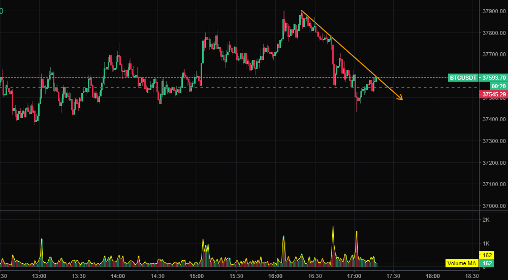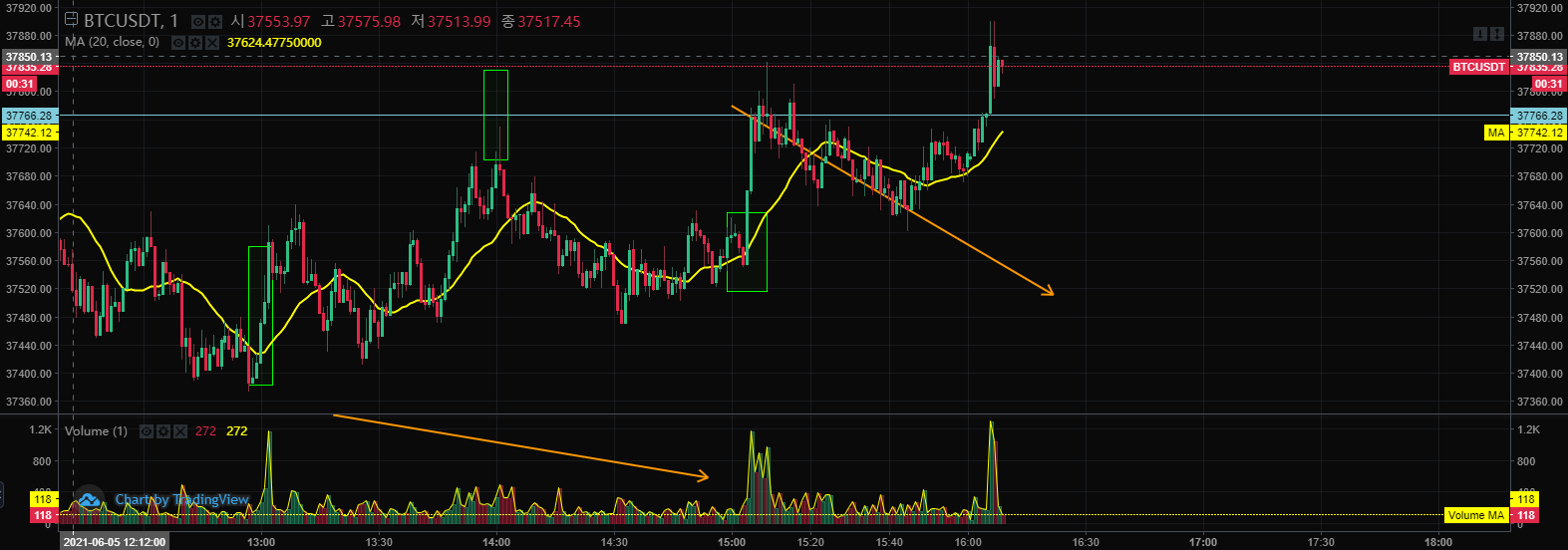 익절 하고 재진입 타이밍을 기다리고 있는데, 급락 구간(음봉 거래량 ↑)이 나왔다. 그래서 일단 상황을 지켜보다가 다시 한번 급락이 나오는 것을 확인, 지지선이 깨지는 것을 보고 바로 숏포지션을 잡았다. 휩쏘일 수도 있지만 세력이 물량을 던졌다고 판단했기 때문에 하락을 기대하고 있다. 지지선을 깨면서까지 물량을 던졌다는 것은 추세돌파가 어렵기 때문에 설거지를 목적으로 하는 것일 수도 있겠지만, 2번의 매도 물량으로 봤을 때, 아랫꼬리도 생기지 않는 것(2번째 급락 구간에서 아랫꼬리가 생기긴 했다. - 덤핑 후 펌핑일 수도 있다.)으로 봐서 숏포지션을 잡는 것이 확률 상 높을 것이라 생각했다. 숏으로 추세선 위로 스탑로스를 걸어두고 상황을 지켜보도록 했다.