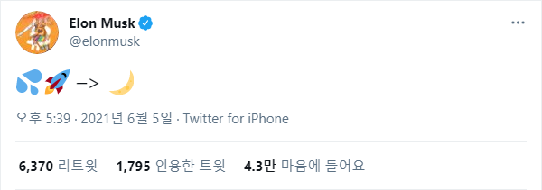 물, 로켓, 달 이 중에서 일단 명확하게 해석할 수 있는 것은 로켓과 달이다. 하지만, 물방울은 무슨 의미일까? 참고로 일론 머스크의 트윗은 비트코인 캐릭터 이미지에 레이저 아이가 그려진 이미지다. 레이저 아이는 비트코인의 부흥을 의미하기도 한다. 갑작스럽게 일론 머스크가 비트코인 캐릭터 이미지를 프로필 이미지로 하고, 최근에 깨진 비트코인 이모티콘을 사용하기도 하고, 물로켓이 달로 가는 트윗을 쓰는가 하면 여전히 비트코인에 대한 관심은 많은 듯하다.
