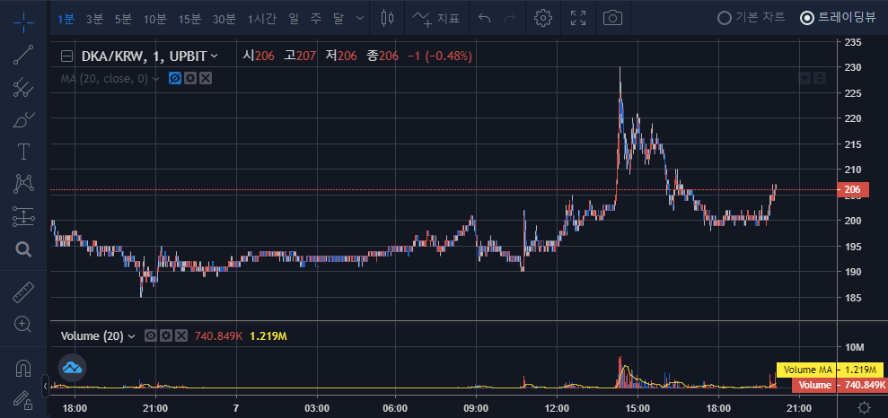 나라시 만들어놓고 얼마 만에 슈팅한 건지 디카르고가 가는걸 다 본다. 일단 지금까지 봤을 땐 한번 슈팅을 했기 때문에 설거지용으로 한번 더 펌핑할 것으로 보이는데, 가격은 안 올리고 거래량만 만들어놓고 뺄 수도 있기 때문에 탈 거면 미리 타거나 해야 하지, 위의 상태에서 타는 것은 위험하다. 혹은 가격이 조금 붙으면 타거나 해야 한다.