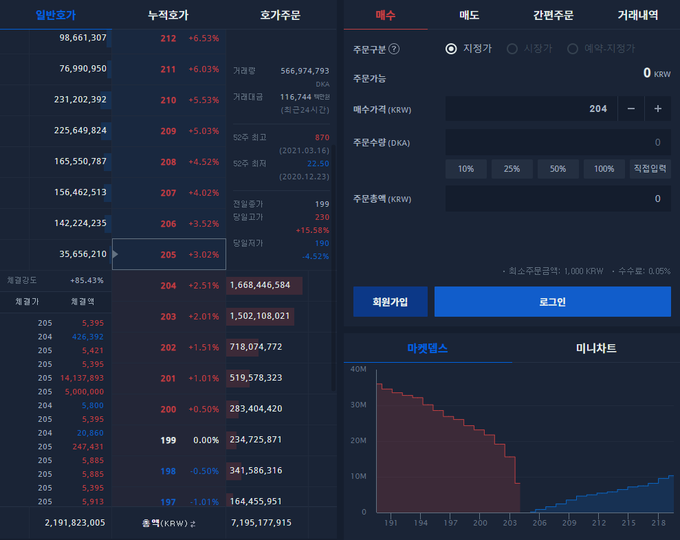 디카르고 자전거래 및 31억 매수벽, 마켓뎁스 보고 개미들 꼬시기 시작, 사실 이런 종목은 차트 볼 필요도 없지만 급등주 공략에 있어서 눈여겨볼 필요가 있다. 분명 6월 5일 날 슈팅 나오고 장대음봉으로 마감을 했는데, 물량을 다 못 털었는지 오후 2시에 다시 한번 슈팅을 하고 거래량을 올리면서 슬슬 시동을 걸고 있다. 지금은 선물거래에 집중하고 있기 때문에 직접 참여는 안 하겠지만, 주식과 달리 코인은 신호가 오면 당일 바로 슈팅을 하는 경우가 있다.