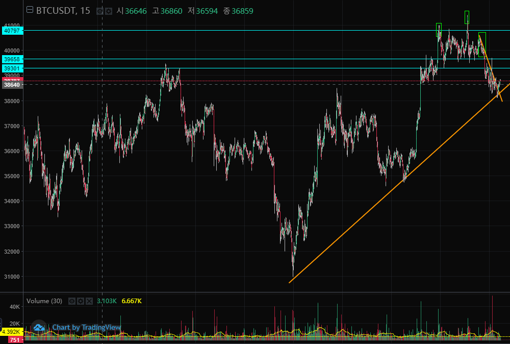 일단, 오늘 하루는 상황을 지켜보고 포지션을 잡는 것이 중요할 듯 하다. 만약, 상승추세가 이어진다면 그대로 39.3~6K 저항선을 뚫고 상승하겠지만, 그게 아니라면 저항선을 맞고 그대로 튕겨 나와 추세전환이 발생할 수 있기 때문이다.