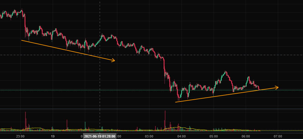 이런 상황에서 해야할 것은 단기적으로 가격이 올라왔을 때 숏포지션을 잡거나, 35K가 뚫렸을 때 돌파매매를 들어가는 것이다. 지지선이 깨지는 순간부터는 하락에 가속이 붙기 때문에 반등이 쉽지 않다. 게다가 그동안 가격이 많이 올라왔다면 더욱더 하락할 가능성이 크다. 시세가 오르면, 내려가는 것이 일반적이기 때문이다. 하지만, 지금은 전체적인 흐름을 봤을 땐, 롱포지션이 위치한 자리다. 단기적으로 봤을 땐 하락하고 있기 때문에 숏포지션을 잡는 것은 맞지만, 여기서 한 번 더 반등을 줄 수도 있고, 그대로 하락한다면 저점을 찍을 때까지 기다리는 것이 유리하다.