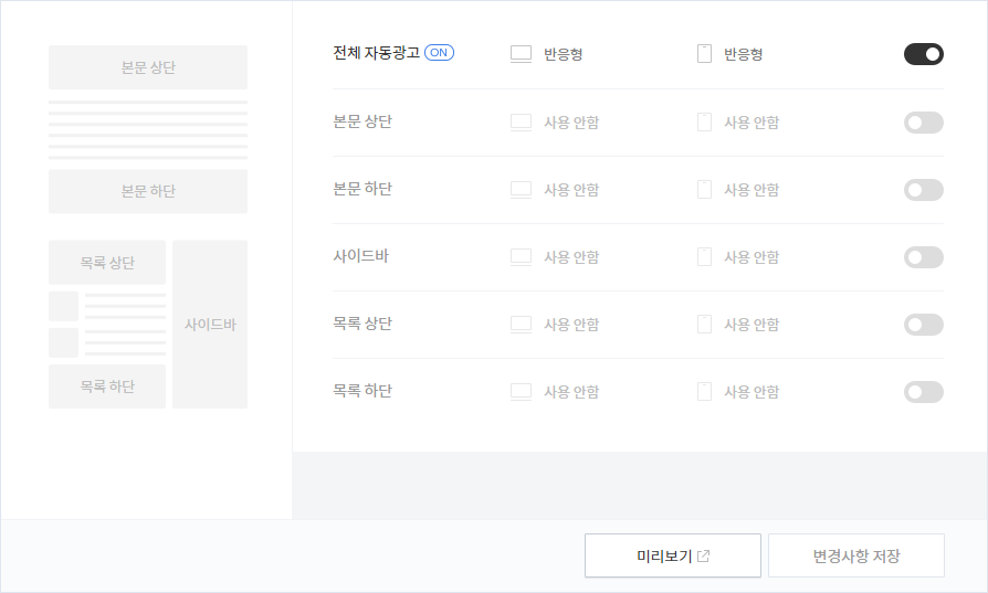 제어가 가능한 광고 설정은 전체 자동광고, 본문 상단, 본문 하단, 사이드바, 목록 상단, 목록 하단 전부 사용이 가능합니다. 혹은 직접 HTML 편집 기능을 통해 원하는 레이아웃에 광고 코드를 삽입하여 광고를 진행할 수 있습니다.