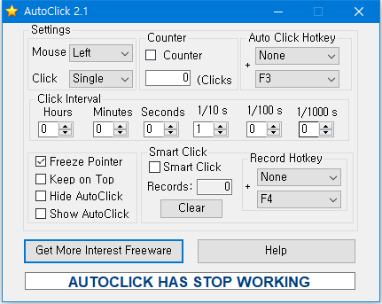 클릭간격을 조절도 가능해서 세밀한 간격으로 설정이 가능하다. 스마트 클릭이라고 해서 기록횟수를 체크할 수도 있다. 이외에 오토클릭을 가리거나 표시하는 등의 기능, 그리고 해당프로그램이 항상 위로가게 하는 기능(Keep on Top) 포인트를 동결시키는 기능 등이 있다.