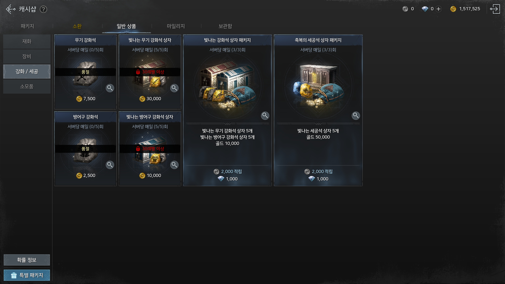 - 일반 상품 중 "빛나는 방어구 강화석 상자"에 대한 확률