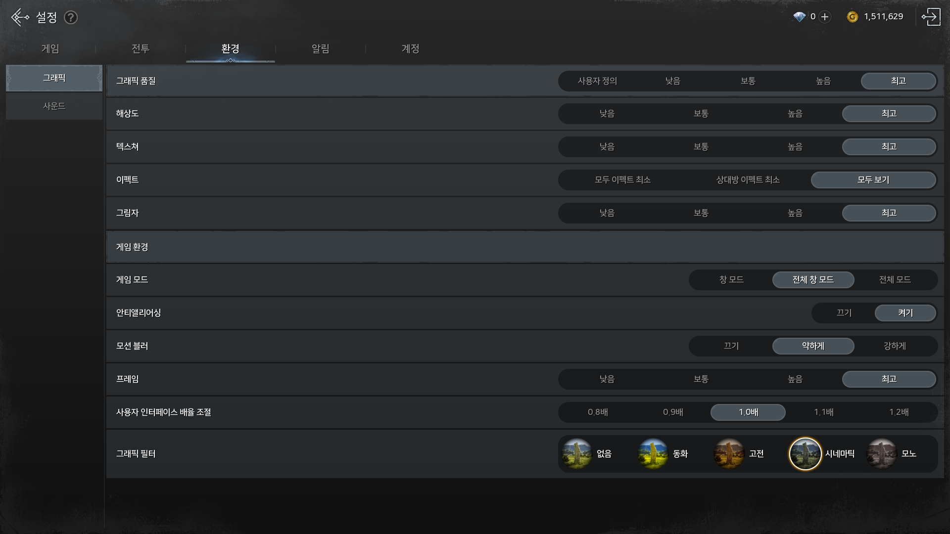 안티앨리어싱은 텍스쳐가 부드러워지므로 켜는 것을 추천한다. 모션 블러를 캐릭터나 몬스터 등이 움직일 때, 블러 처리가 되므로 스피드감을 느낄 수 있다. 모션 블러를 끄게 되면 선명해지기 때문에 조금 더 게임다운 느낌이 든다. 여기서 더 설정할 수 있는 부분은 바로 그래픽 필터다. 그래픽 필터를 통해 동화, 고전, 시네마틱, 모노를 통해 영화 같은 게임을 즐길 수 있게 된다.