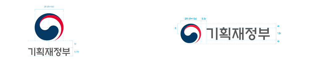 정부 상징 마크의 반지름을 기준, 정부상징 마크의 중심축을 “기획재정부”와 결합의 중심축으로 사용하였습니다.