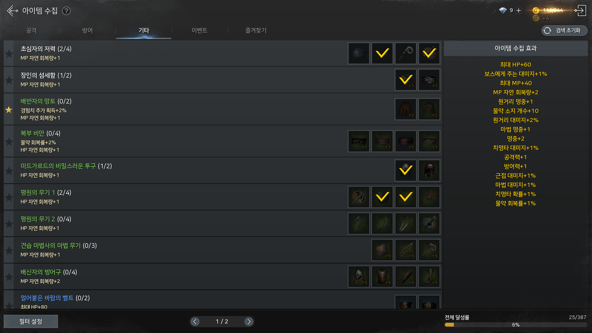 위와 같이 기타 옵션에서 필터설정을 통해서 MP 자연 회복량을 챙길 수 있는 수집 항목을 찾을 수 있다. 생각보다 쉽게 챙길 수 있는 요소가 많기 때문에 반드시 챙겨줘야 한다. 물약 소모를 줄이기 위해서라도 HP 자연 회복량도 같이 챙겨주면 좋다. 저렙 사냥터에는 물약을 소모할 일이 많지 않지만, 던전 등을 돌게 되면 장기간(8시간) 사냥을 해야 하기 때문에 중간에 물약이 부족할 수 있다.