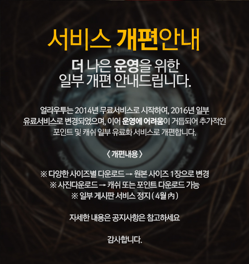 오랜만에 한국적인 이미지를 찾기 위해서 얼라우투에 접속을 했는데, 아래와 같이 서비스 개편 안내 배너가 떴다. 사실 무료로 이용할 수 있는 저작권 프리 사이트가 많아서 앞으로 얼라우투는 자주 접속하지 않게 될 것 같다. 얼라우투가 좋았던 것은 여타 다른 사이트에 비해서 한국적인 이미지가 가장 많았기 때문이다.