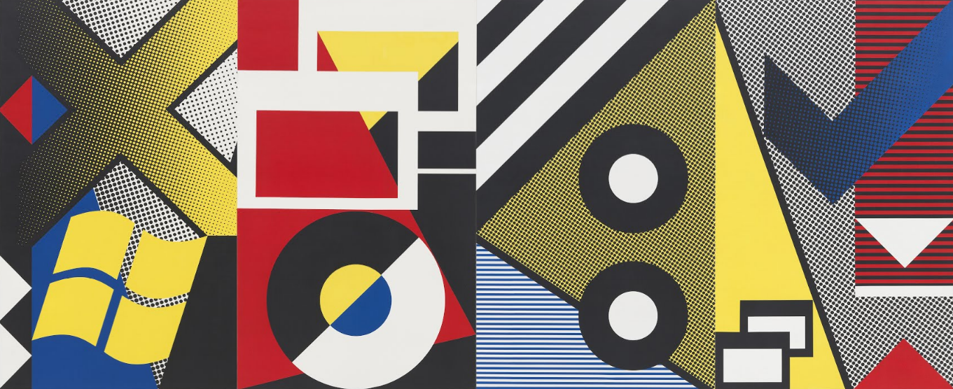 Echoing Pop artist Roy Lichtenstein’s characteristic flat, representational style, his signature Ben Day dots as well as the bright primary colour palette he borrowed from commercial printing processes, Coupland has created paintings that revisit this Pop artist’s work while simultaneously recasting the ubiquitous signs and symbols of today.Better Living Through Windows_references Lichtenstein’s_Modern Painting with Clef(1967) in its abstract modern composition, but it is crafted using contemporary iconography such as a TrueType font called Marlett that has been used by Microsoft since 1995 to create user interface icons. Similarly, Coupland’s riff on sunsets replaces Lichtenstein’s sky and ground with barcodes from flight luggage tags and his sunbeams with grocery packaging registration codes.