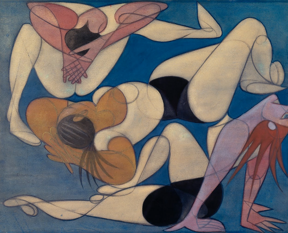 Although we are dealing with a gouache, the presence of the line in the definition of the surfaces and general scheme of the composition assumes a vital role here. The colour is bland and refuses the chiaroscuro that suggests depth in space. The proximity with the frescos of the Rocha Conde de Óbidos Maritime Terminal, which was only completed in 1949, is explicit. The skilful advantage of the continuous drawing composes figures in arabesque with great ease. The creation of encounters between surfaces, where the same line defines parts of two different forms that are thus made complementary, or the superimposition of planes that exhibit arabesques and as such, animate and highlight the omnipresence of the line, expose a play of extreme masterlyness. If such a powerful drawing affirms itself over colour, it is in the exacerbation of the drawing's genius that we find an unexpected suggestion of décor which limits its intents.