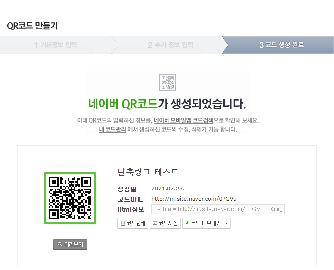 위와 같이 네이버 QR코드가 생성되었습니다. 제목은 단축링크 테스트로 했는데, 제대로 링크가 작동하는지 확인해볼 필요가 있겠습니다. 자신이 생성한 코드로 접속해보고 얼마나 많은 사람이 액션을 했는지 통계에서 확인할 수 있습니다. 링크는 여러 방법으로 활용할 수 있으며, QR코드가 필요하다면 코드 저장을 눌러 이미지로 저장해서 활용할 수 있습니다. 웹페이지 등에도 HTML로 표시가 가능합니다.