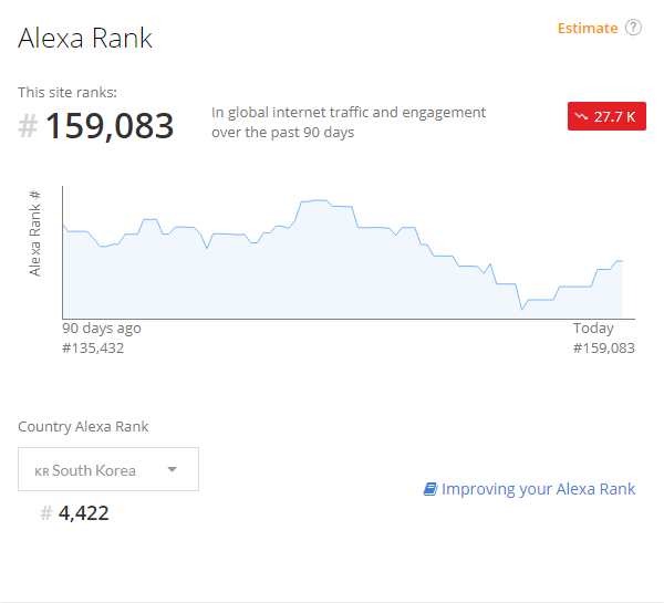 아마존 알렉사를 통해서 자신이 운영하고 있는 웹사이트나 블로그의 글로벌 랭킹을 확인할 수 있는 것이다. 다만, 티스토리의 경우에는 2차 도메인만 순위를 확인할 수 있다. 별도의 도메인이 설정되어 있지 않은 티스토리 블로그의 경우에는 1차 도메인으로 인식되기 때문에 자산의 글로벌 랭킹을 정확하게 알 수 없다.
