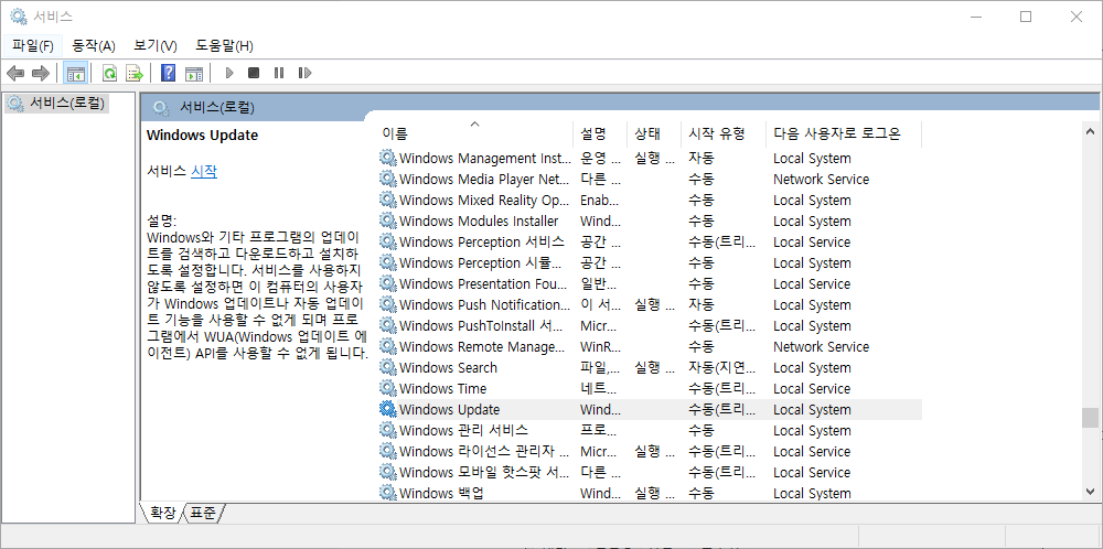 이와 같은 명령어는 해당 파일이 실행하고 있는지 확인하는 명령어다. 정상적으로 실행되고 있다면 이제 이 기능을 수동으로 중지해줄 것이다. 해당 방법은 윈도우 업데이트 속성에서 끌 수 있다.