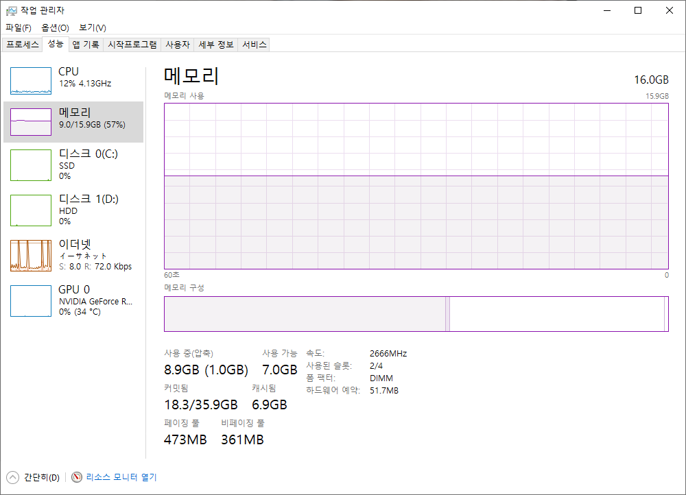 최근에 메모리가 부족한 경험이 있어서 리소스 모니터를 살펴봤더니, 위와 같은 파일이 많은 메모리를 차지하고 있었다. 이후에는 별다른 조치를 하지 않았는데 더 이상 메모리에 할당되지 않았다. 컴퓨터를 잘 알아가는 것은 단계적으로 해결해야 하는 것이므로 어떤 파일이 어떤 의미를 가지고 있는지 알아야 할 것이다.