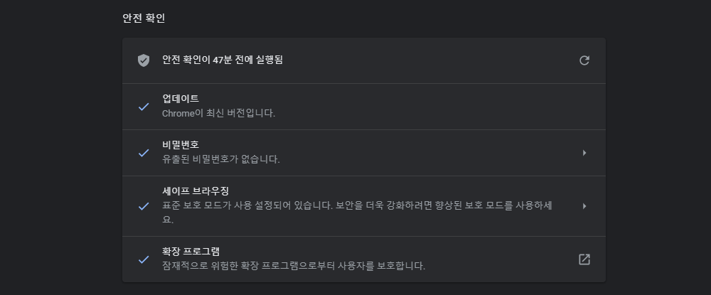 안전 확인은 구글 크롬 설정 chrome://settings/safetyCheck에서 가능하다. 위의 사진에서 안전 확인 버튼을 클릭하면 바로 검사가 진행된다. 그 외에 별다른 설정은 필요 없다. 세이프 브라우징의 경우에는 위험한 사이트로부터 보호되기 때문에 피싱 등의 위험을 막아준다.