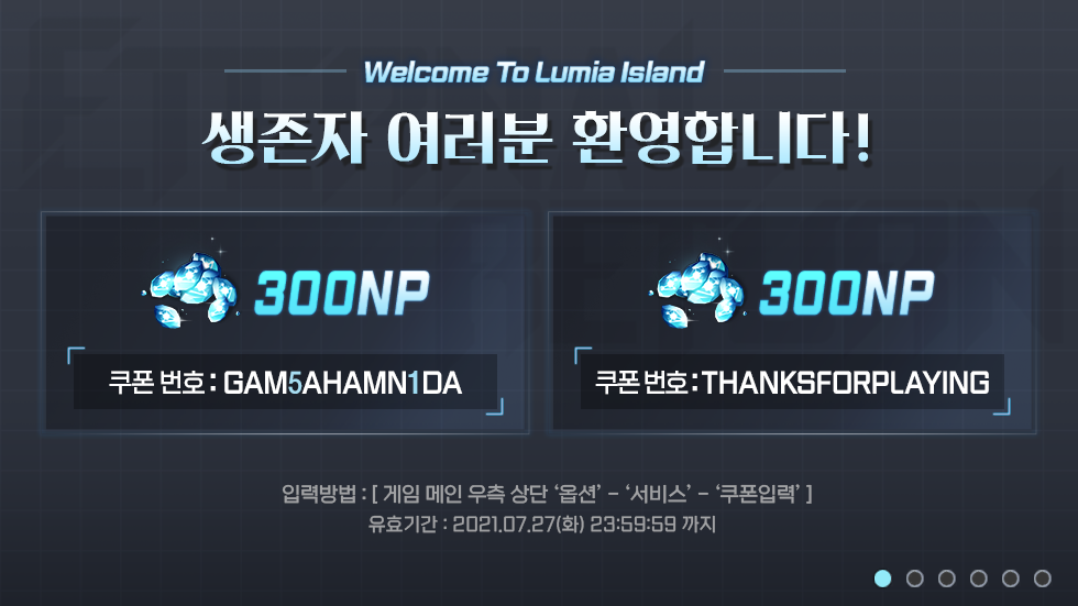 | 오픈기념쿠폰 | 2021.07.27(화) | 300NP | 없음 | THANKSFORPLAYING |
