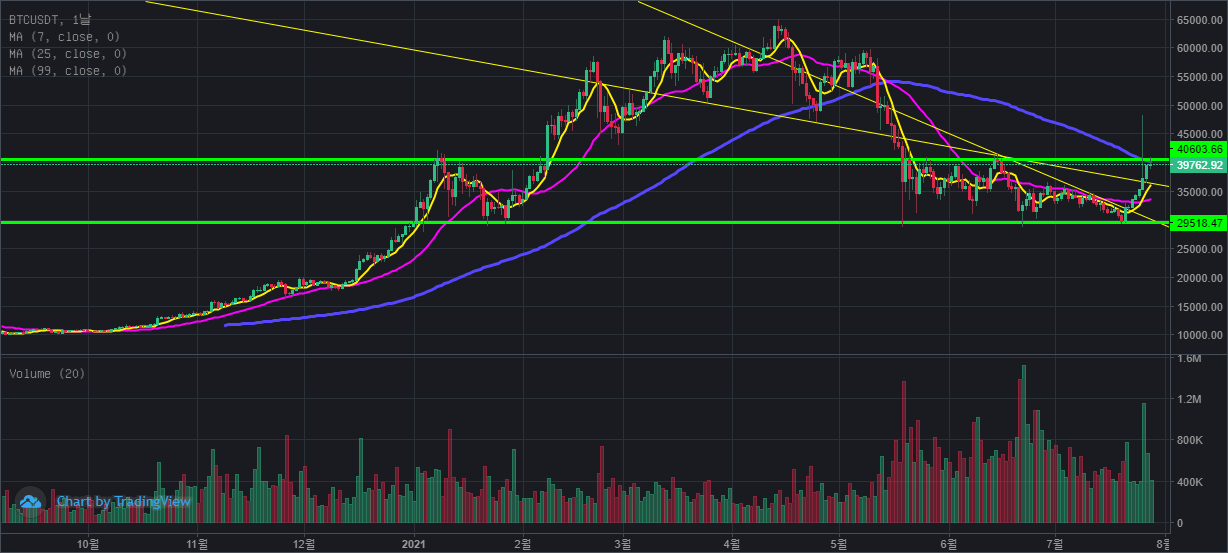 다만, 내 경우에는 주식에서의 차트 분석을 그대로 활용하기 위해서 7일, 25일, 99일로 두고 활용하고 있다. 이동평균선은 진입과 이탈을 할 때, 기준이 된다. 이는 추세선을 조합해서 활용한다.
