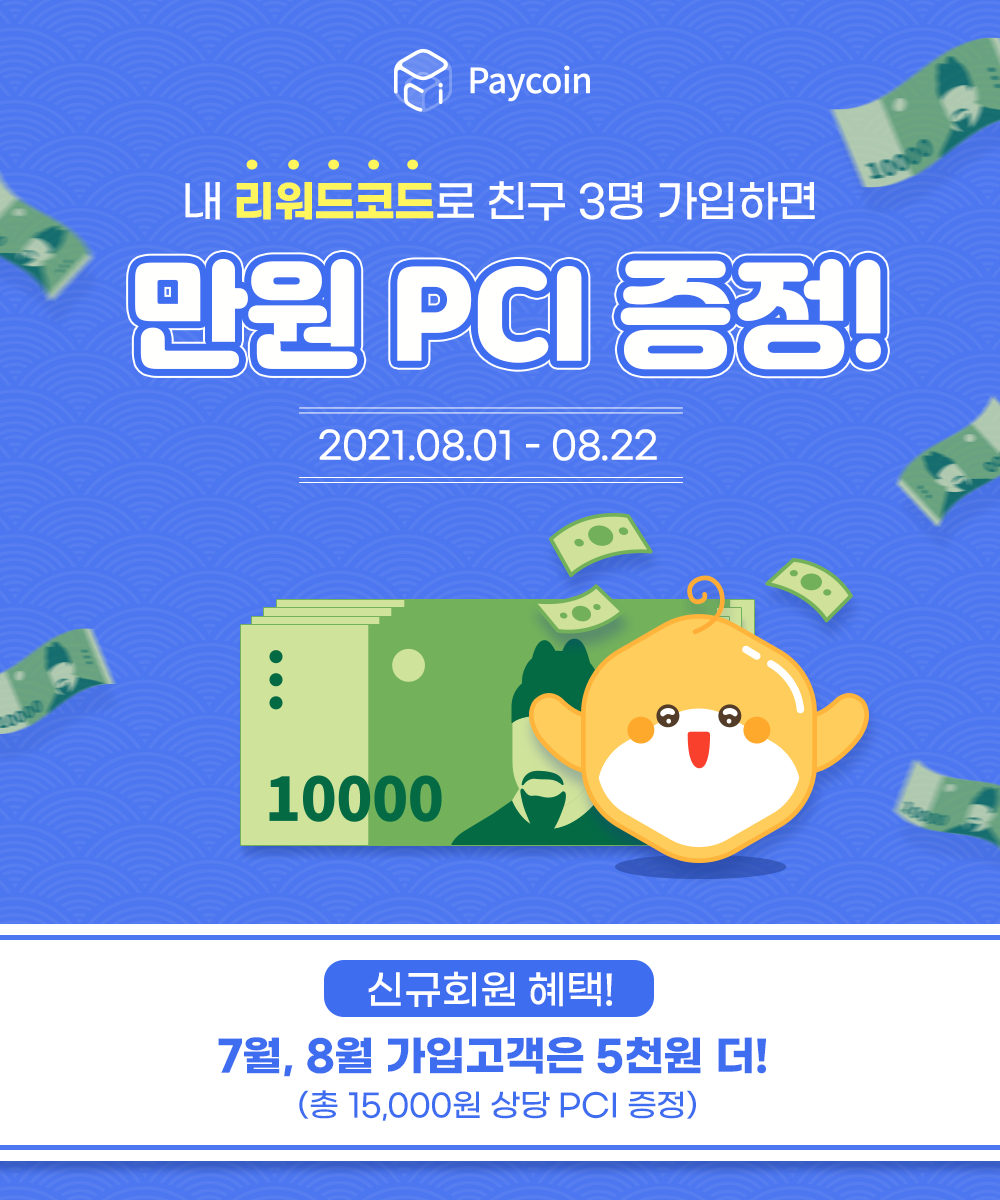 - 추가 지급되는 PCI는 이벤트기간 내 추천인코드 신규가입자 수를 합산하여 3인 이상=1만원 상당의 PCI가 지급되며, PCI 수량은 지급 시점의 PCI-KRW 환율에 따라 결정됩니다.