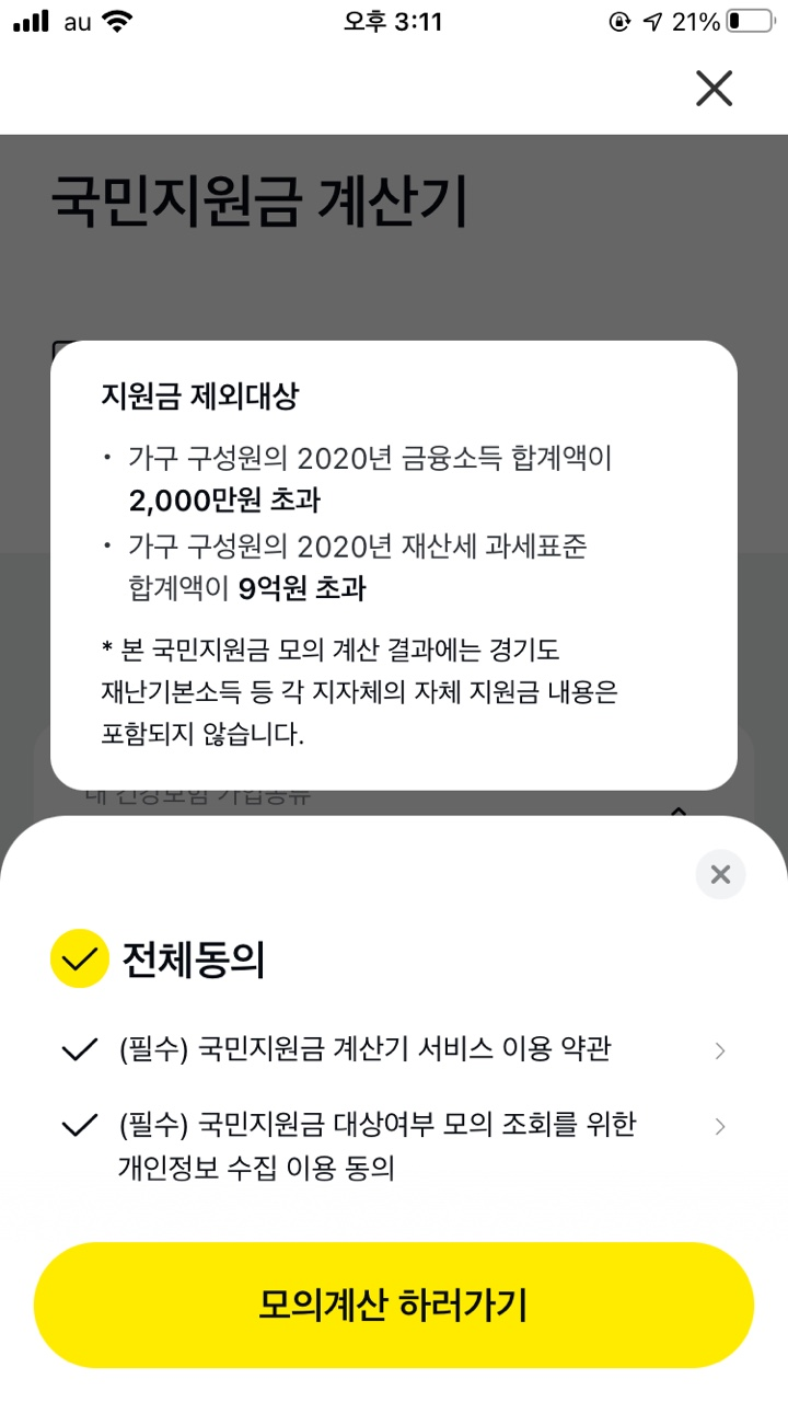 카카오톡 설정에서 카카오페이로 이동합니다. 서비스 카테고리 중에서 국민지원금 계산기를 선택하면 수령액 조회가 가능합니다. 지원금 제외 대상은 가구 구성원의 2020년 금융소득 합계액이 2,000만원 초과하거나 가구 구성원의 2020년 재산세 과세표준 합계액이 9억원을 초과하게 되면 지원금 지급 대상에서 제외됩니다. 다만, 경기도 재난기본소득의 경우는 국민지원금과 다른 자체 지원금이기 때문에 해당되지 않습니다.