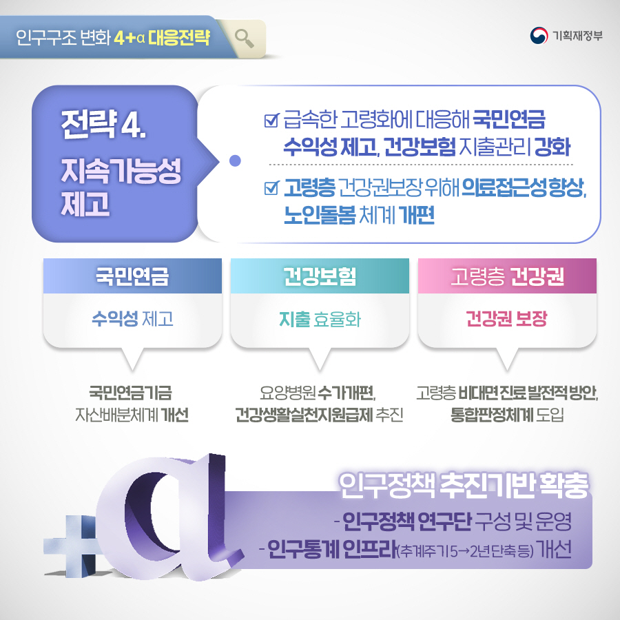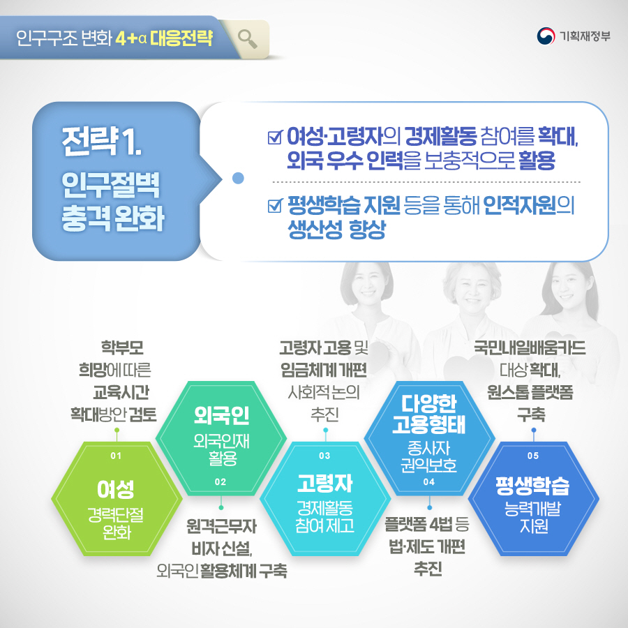 이러한 인구구조 변화에 대한 정부의 대응전략은 아래와 같다.