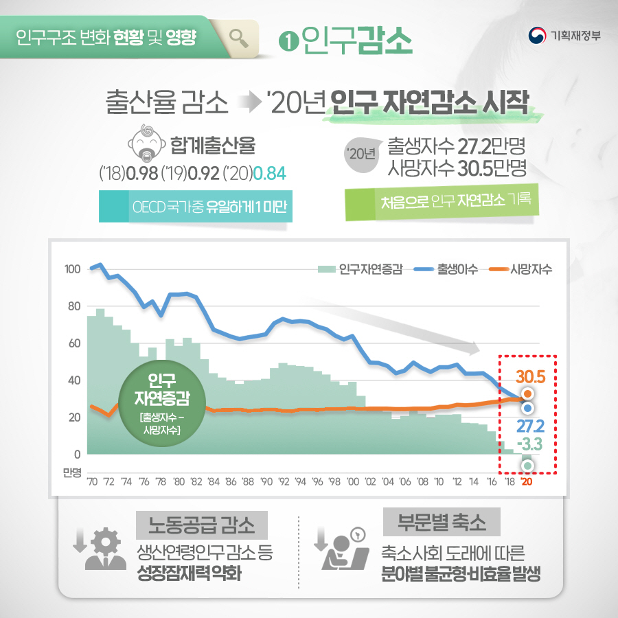 20년 기준 합계출산율은 0.84로 OECD 국가 중 유일하게 1명 미만으로 가장 출산율이 저조한 나라가 바로 대한민국이다. 처음으로 인구 자연감소가 기록되어 시간이 지날수록 인구가 줄어들게 된다.