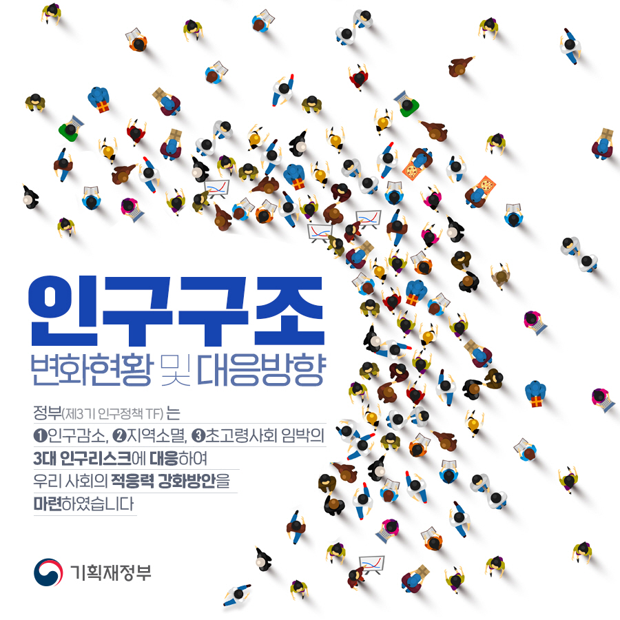 기획재정부에서는 대한민국의 미래 인구구조 변화현항 및 대응방향을 자세히 안내하고 있다. 앞으로 인구가 축소될 대한민국에서 개인과 기업이 어떻게 대처해야하는지 생각해볼 수 있는 기회가 될 수 있다.