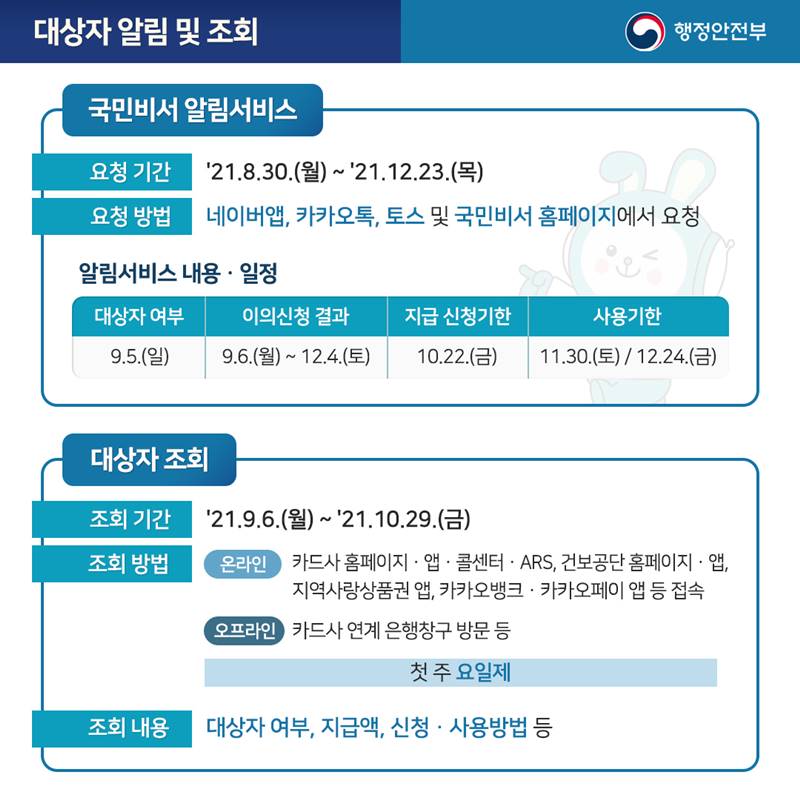 카카오톡으로 국민지원금 대상자 조회와 신청을 하기 위해서는 카카오뱅크나 카카오페이 앱에서 이용이 가능하다. 올해까지 사용할 수 있으며, 사용하지 않은 금액은 지자체로 자동 환불된다. 여기까지 국민지원금을 신청하는 일반적인 방법이다.