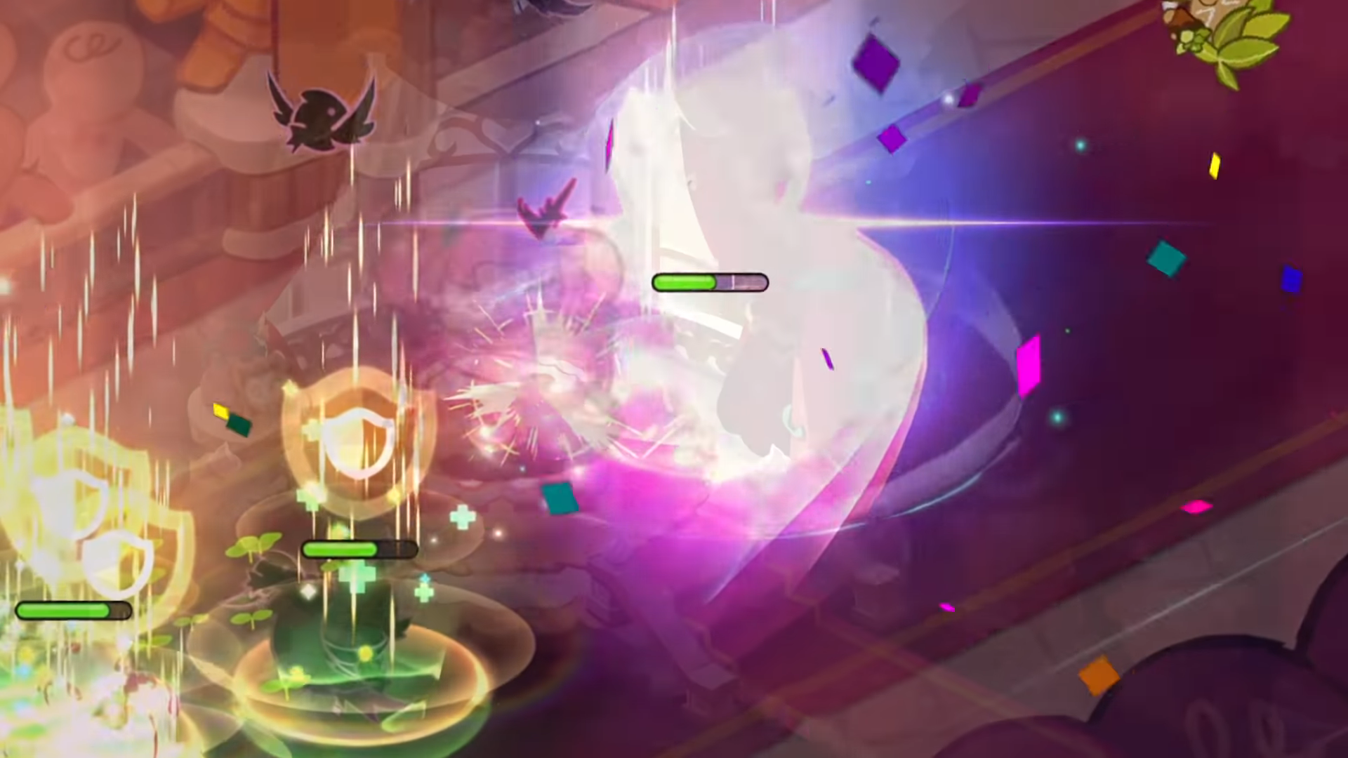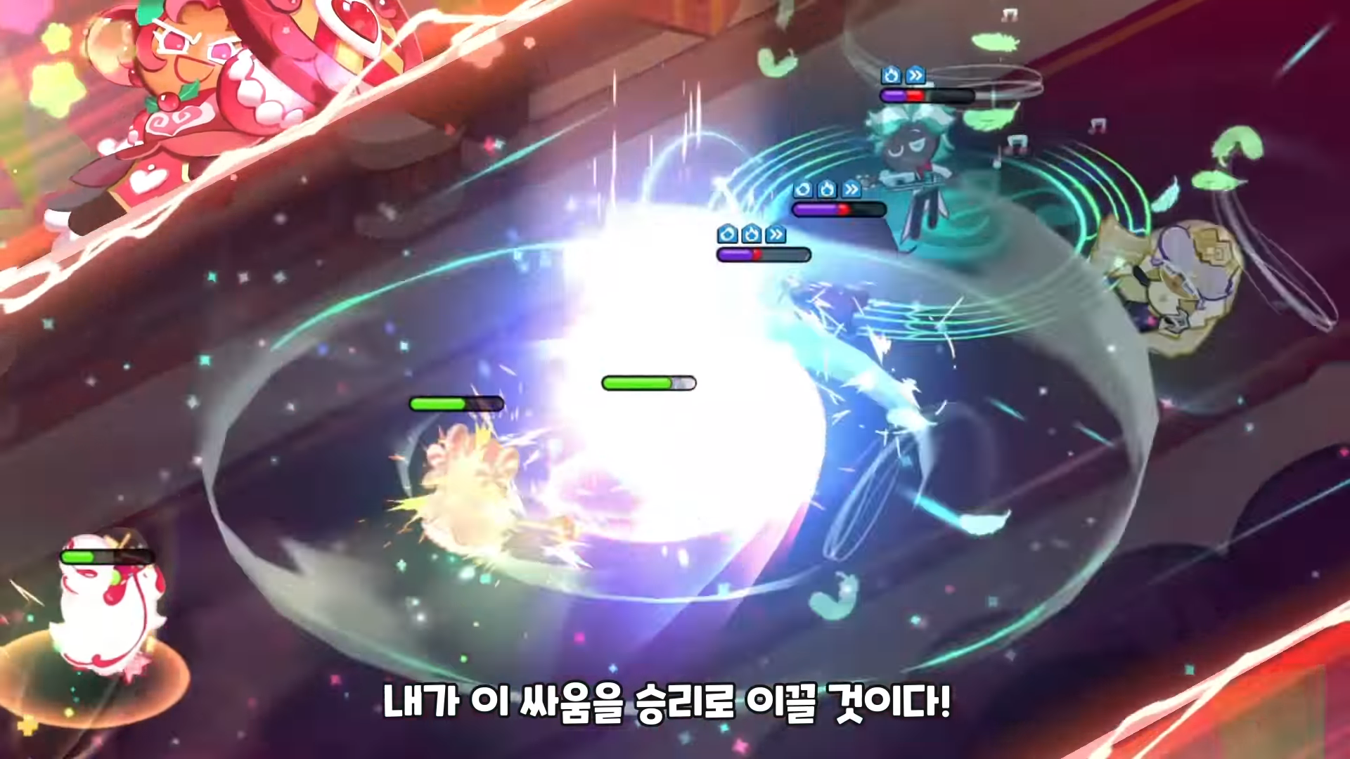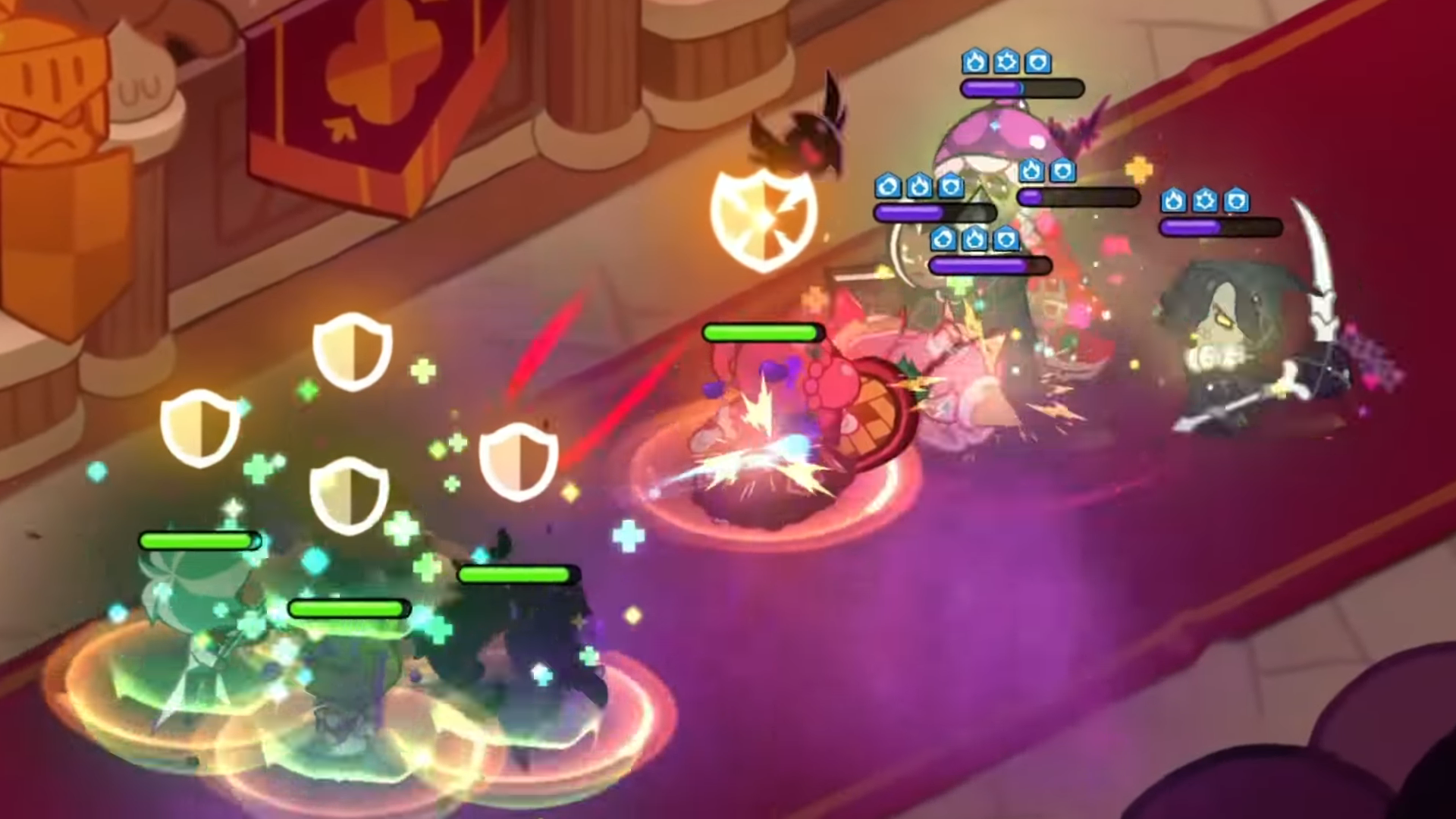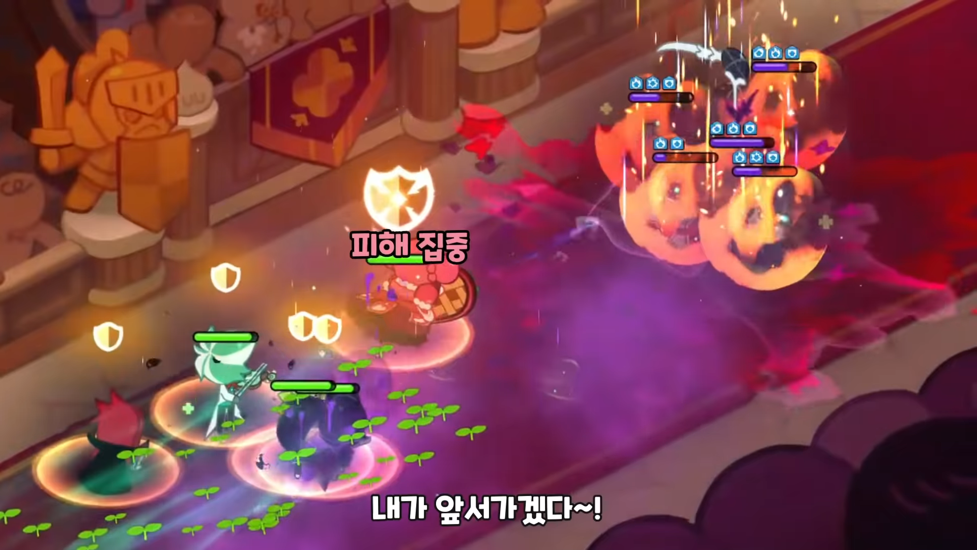 - 스킬 설명 : 함성을 질러라! 베리-홀리 방패로 두려움 없이 돌진한다. 추가로 모든 아군 쿠키의 지속 피해, 간접 피해를 제외한 피해 일정량을 대신 흡수한다. 스킬 시전 시간 일부 중 스킬 끊김을 포함한 스킬 시전 방해 효과에 강해진다.