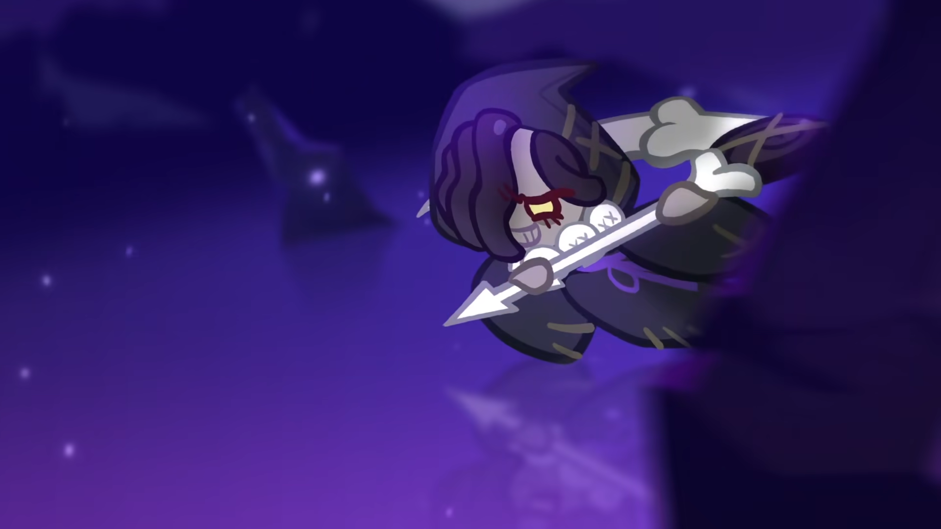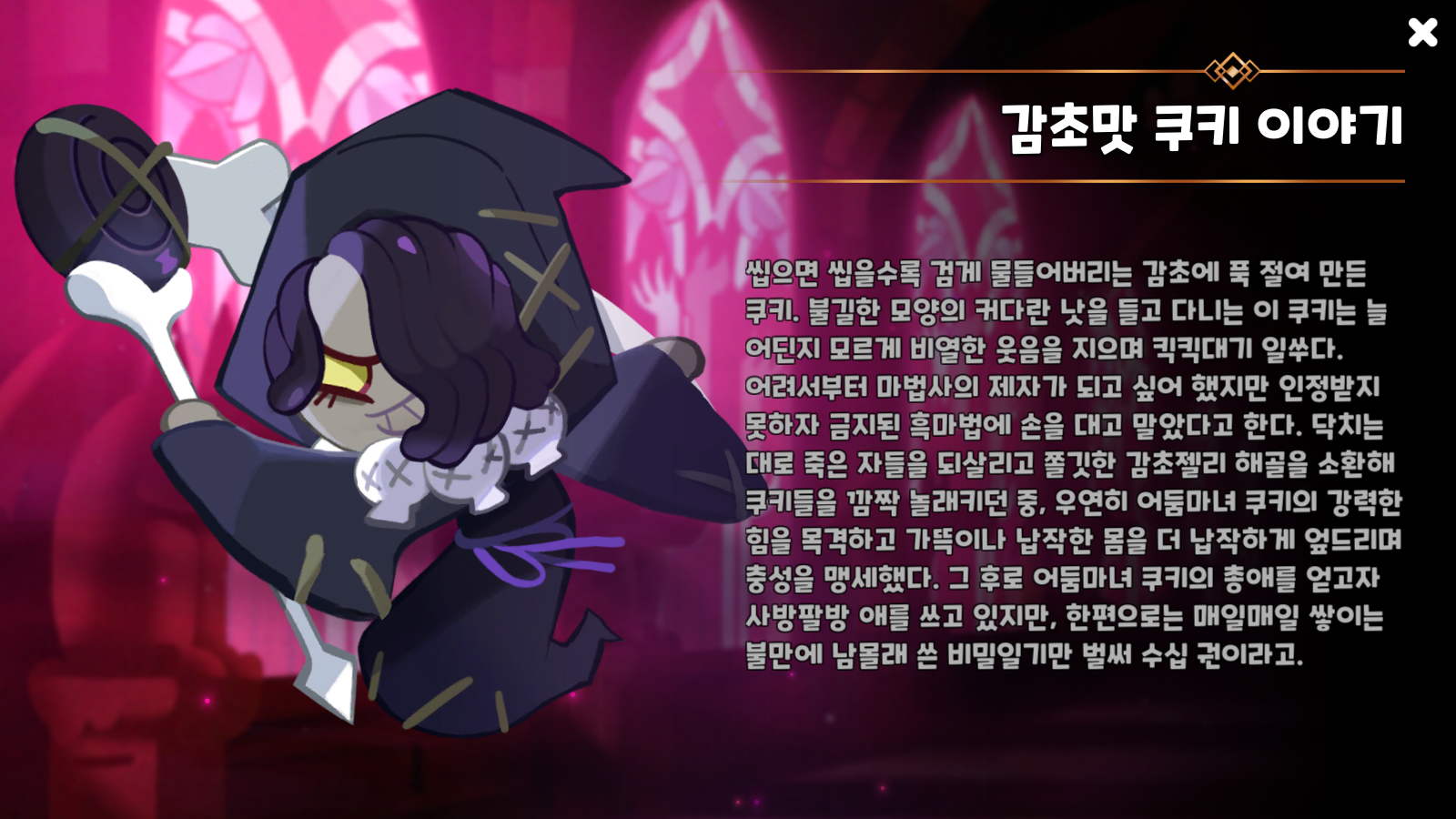 씹으면 씹을수록 검게 물들어버리는 감초에 푹 절여 만든 쿠키. 불길한 모양의 커다란 낫을 들고다니는 이 쿠키는 어딘지 모르게 비열한 웃음을 지으며 킥킥대기 일쑤다. 어려서부터 마법사의 제자가 되고 싶어 했지만 인정받지 못하자 금지된 흑마법에 손을 대고 말았다고 한다. 닥치는 대로 죽은 자들을 되살리고 쫄깃한 감초 젤리 해골을 소환해 쿠키들을 깜짝 놀라게 하던 중, 우연히 어둠 마녀 쿠키의 강력한 힘을 목격하고 가뜩이나 납작한 몸을 더 납작하게 엎드리며 충성을 맹세했다. 그 후로 총애를 얻고자 사방팔방 애를 쓰고 있지만 한 편으로는 매일매일 쌓이는 불만에 남몰래 쓴 비밀일기만 벌써 수십 권이라고.