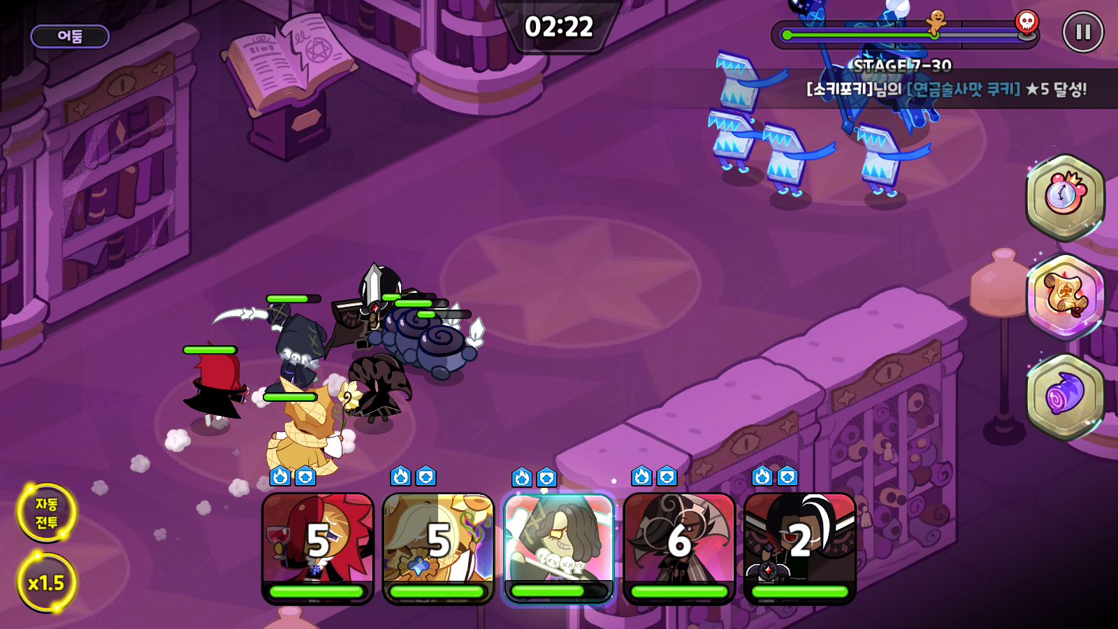 때문에 커스터드 3 세맛 쿠키나 스파클링 맛 쿠키처럼 효과가 적용되는 대상이 달라지는 쿠키를 사용한다면 발동 타이밍을 주의해서 써야 했으나 패치로 인해 소환수보다 쿠키를 우선 치유하게 바뀌었기 때문에 그런 걱정은 사라졌다. 또한 우리 팀이 모두 전멸했는데 해골들만 남아있을 경우, 아레나라면 해골들이 죽을 때까지 전투가 계속 진행되지만 스토리에선 즉시 패배 판정이 난다. 혼돈의 케이크 타워에서는 해골만 살아남아도 승리로 인정되기 때문에 동귀어진 직전 타이밍을 맞춰 스킬을 사용한다면 클리어가 가능하다.
