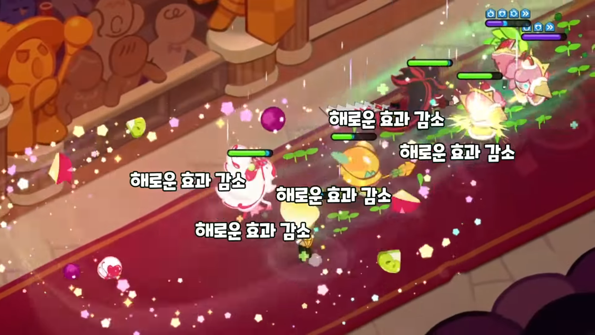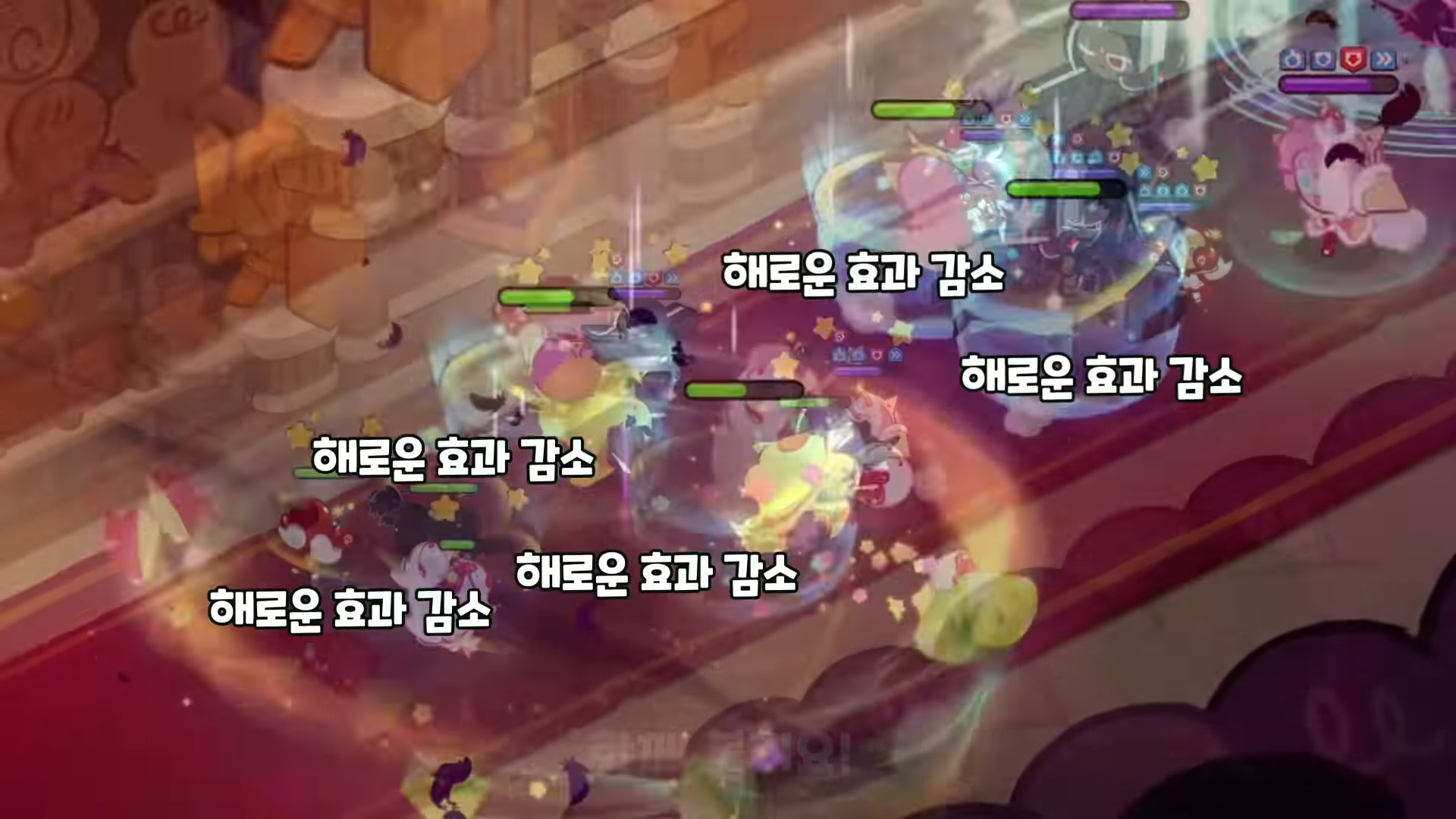 다만 해로운 효과 감소로 라떼맛 쿠키의 침묵 장판, 아몬드맛 쿠키의 확산 디버프, 벨벳케이크맛 쿠키의 스턴 등 일부 디버프의 지속 시간을 줄일 수 있어서 이들의 카운터로 활용될 수 있다. 라떼맛 쿠키, 벨벳케이크맛 쿠키의 경우 딜타임이 꼬이는 현상이 발생하지 않도록 도와주고, 호몬드 덱에게 받는 광역딜을 받아칠 수 있다.