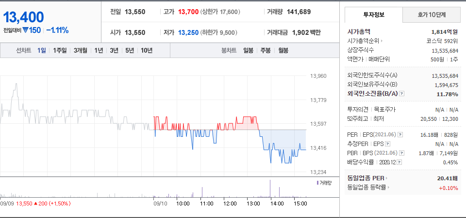 가비아의 경우, 개인적으로 잘 알고 있는 기업이라 생각하고 있으며, 가비아 호스팅이나 도메인을 오랫동안 사용하고 있는 고객이기도 해서 앞으로 가비아 서비스가 지금처럼 꾸준히 잘 운영되고 있기만을 바랄 뿐이다. 최근 주가 흐름을 보면 전체적으로 큰 상승이 있었다가 한 차례 조정이 온 상황이다. 이전 상한가가 약 2만원 정도의 가격이라고 했을 때, 지금 진입해도 나쁘지 않을 가격이라 생각된다.