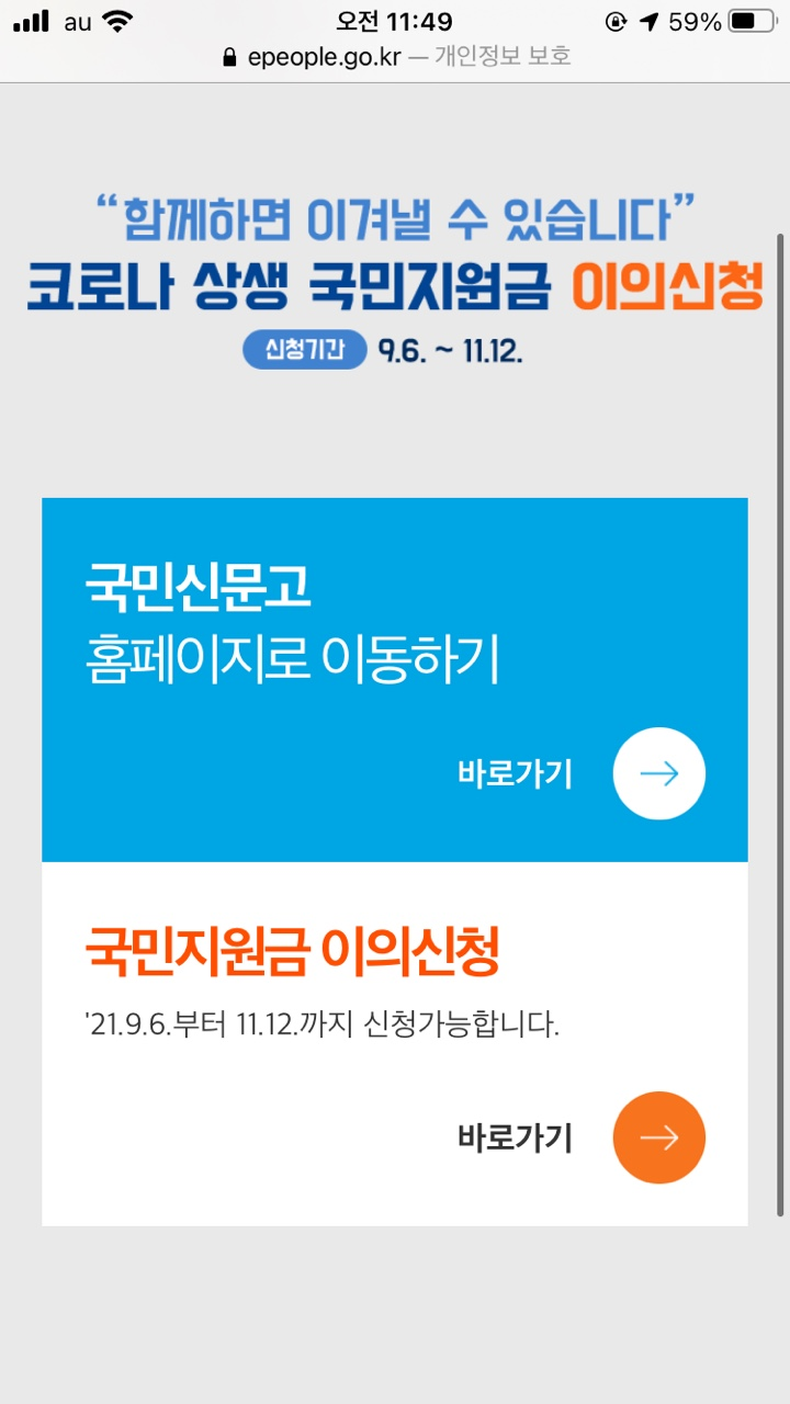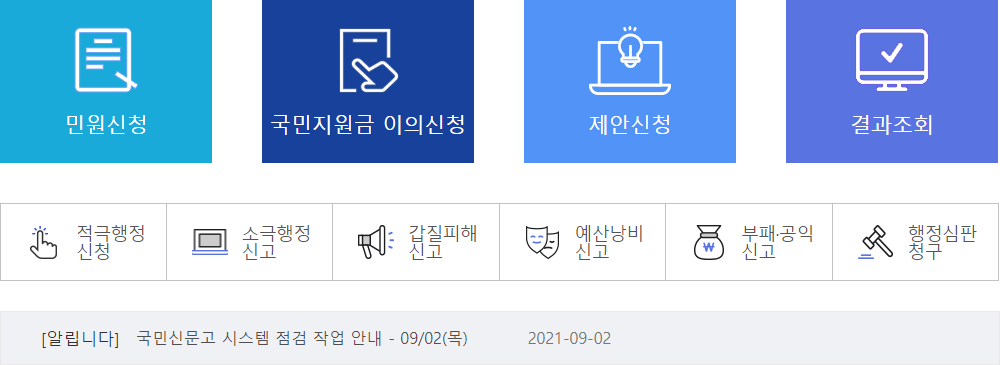 국민신문고 홈페이지에 접속하면 아래와 같이 국민지원금 이의 신청 안내 배너가 있다. 물론, 이곳을 클릭하면 국민지원금 이의신청 페이지로 바로 이동한다.