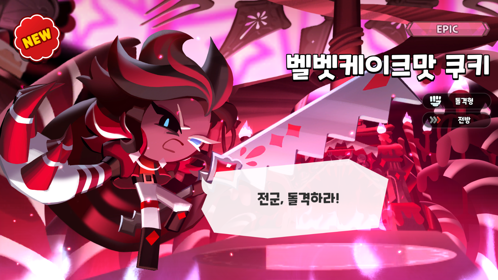 일동 정렬! 제자리에 서! 수많은 케이크 괴물들 앞에서 지휘를 시작하는 벨벳케이크맛 쿠키. 벼락같은 호령이 대지를 흔들면 제멋대로 날뛰던 케이크 괴물도 순식간에 얌전해져 대열을 맞춘다. 케이크 군단의 최전방에서 몸소 전투를 이끄는데, 검은 눈에서 형형한 빛을 번뜩이며 케이크 팔로 적을 제압하는 모습은 가끔 케이크 괴물보다도 무시무시해 보인다. 하지만 케이크 괴물의 재롱을 받아줄 때만큼은 벨벳처럼 부드러워진다는데...? 두께나 반죽의 정도를 보면 쿠키가 틀림없지만 붉은 케이크로 된 오른팔에서 심상치 않은 어둠이 느껴져 도무지 안심할 수가 없다. 그러거나 말거나, 벨벳케이크맛 쿠키는 망설임 없이 자신에게 주어진 일을 해낼 뿐이다. 진격하라! 그리고 살아남아라! 전투의 시작을 알리는 외침이 대지를 뒤흔든다.