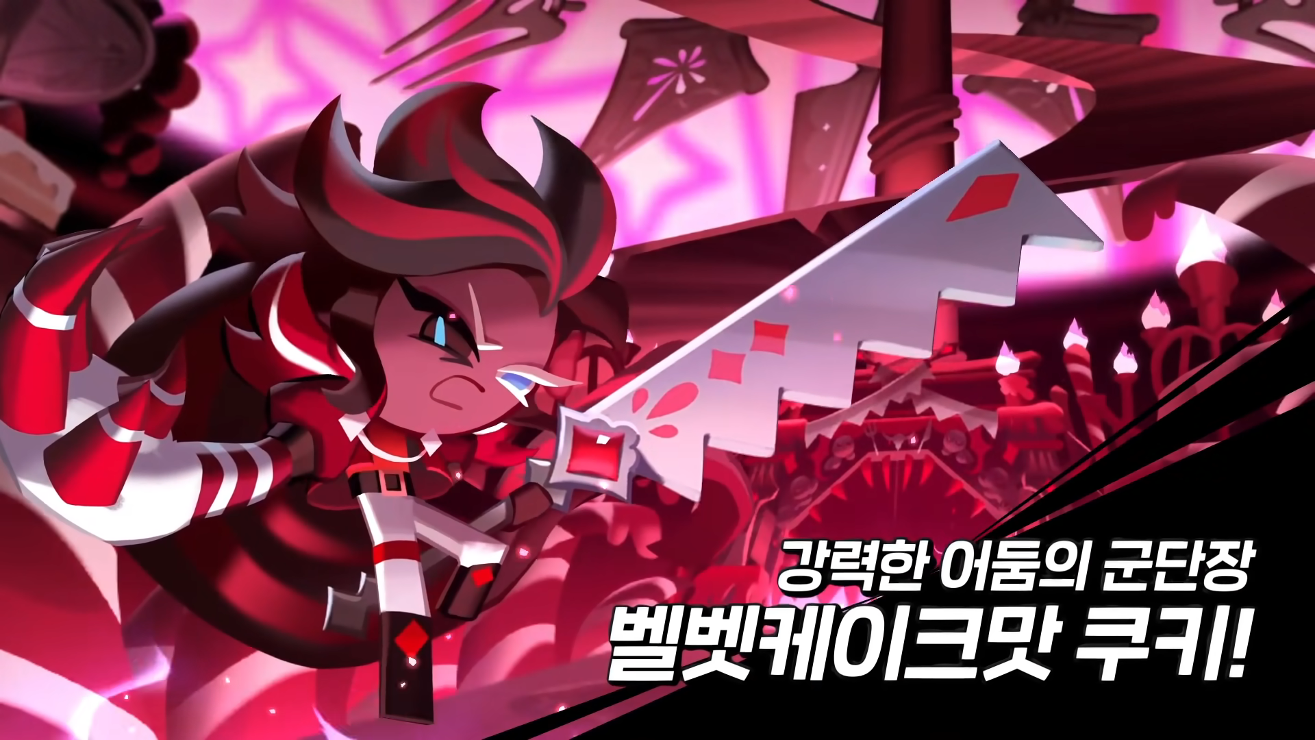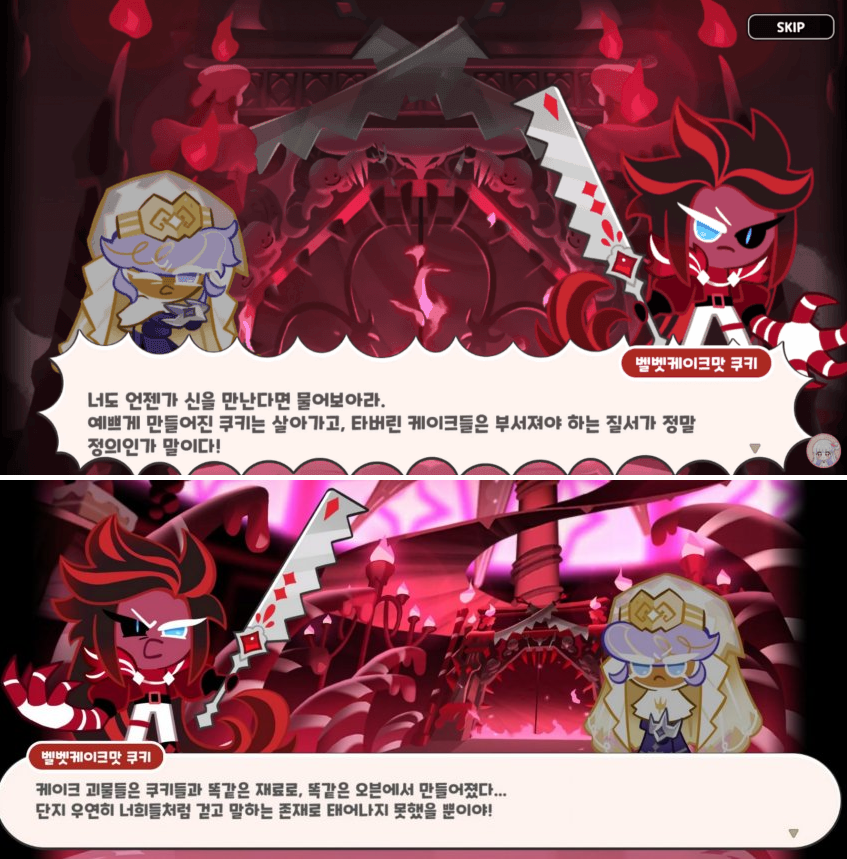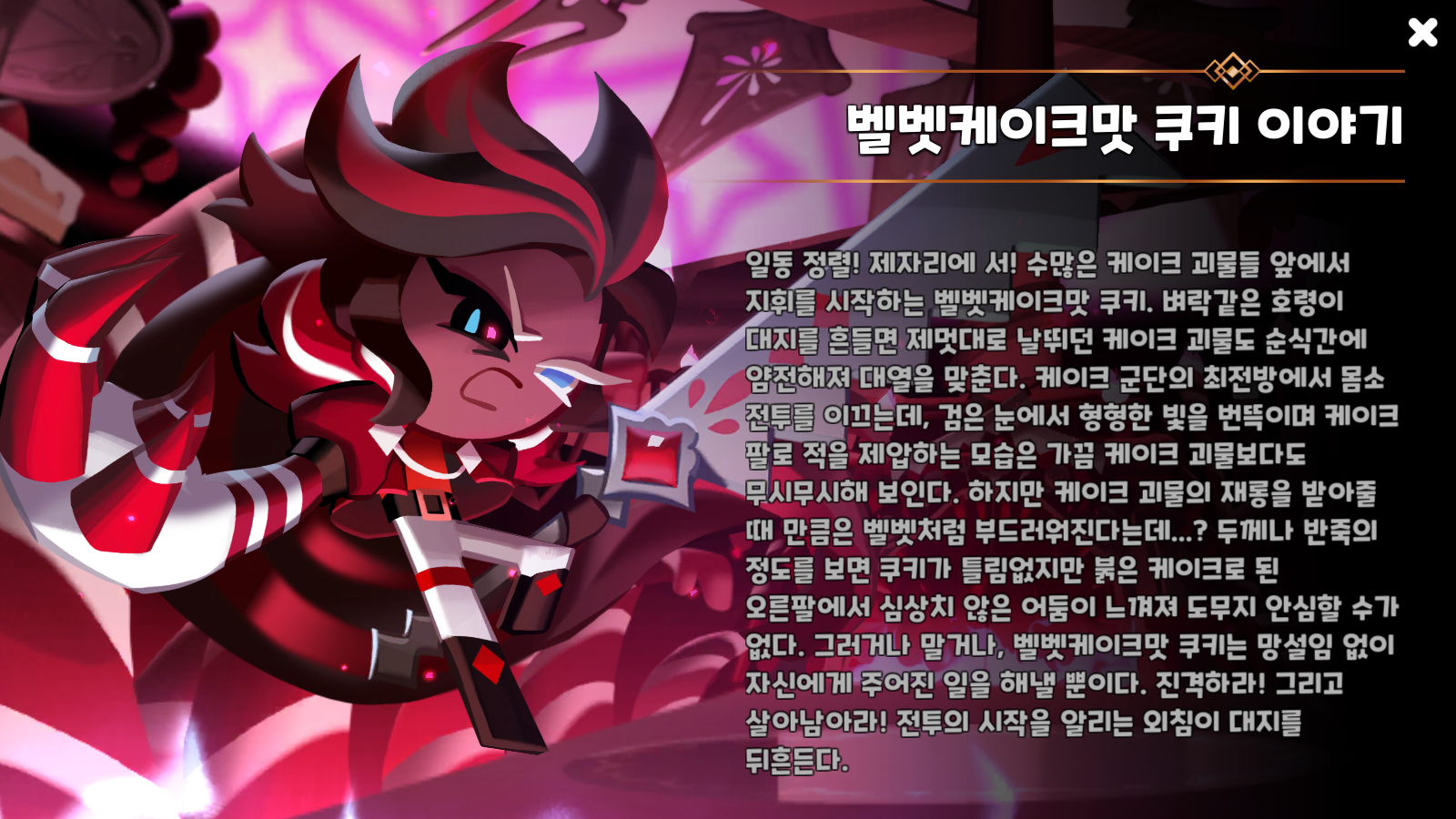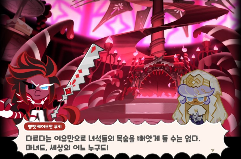 벨벳케이크맛 쿠키의 디자인에 다소 당황을 했지만, 사실 이런 다크한 스타일은 내 취향이다. 또한 설명을 보면, 전체적인 색상은 벨벳케이크처럼 붉은색이며, 오른쪽 팔이 3단 케이크 마녀의 팔과 비슷하게 변형되어 있다고 한다. 또 다른 특징으로는 쿠키 반죽이 아니라, 오로지 케이크로만 이루어진 팔이라고 하며, 무기로는 붉은 보석이 박혀있는 빵칼을 사용한다.