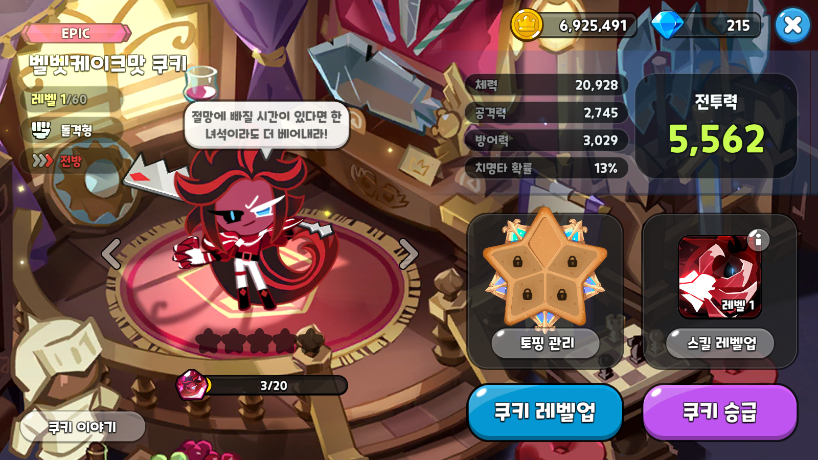 벨벳케이크맛 쿠키는 5월 28일날 업데이트 됐다. 한참 쿠키런킹덤을 안하고, 다른 게임이나 취미에 몰두하고 있을 때 업데이트가 되었던 것이다. 이때까지만 해도 쿠키런 킹덤의 콘텐츠 부족으로 인해서 나처럼 게임을 잠시 접어둔 사람들이 많았던 것 같다. 그래서 그런지, 벨벳케이크맛에 대한 평가도, 사용하는 사람도 거의 볼 수 없다. 물론, 성능이 좋다면 많은 사람들이 사용했겠지만, 에픽 등급임에도 다소 애매한 평가를 받는 듯 하다.