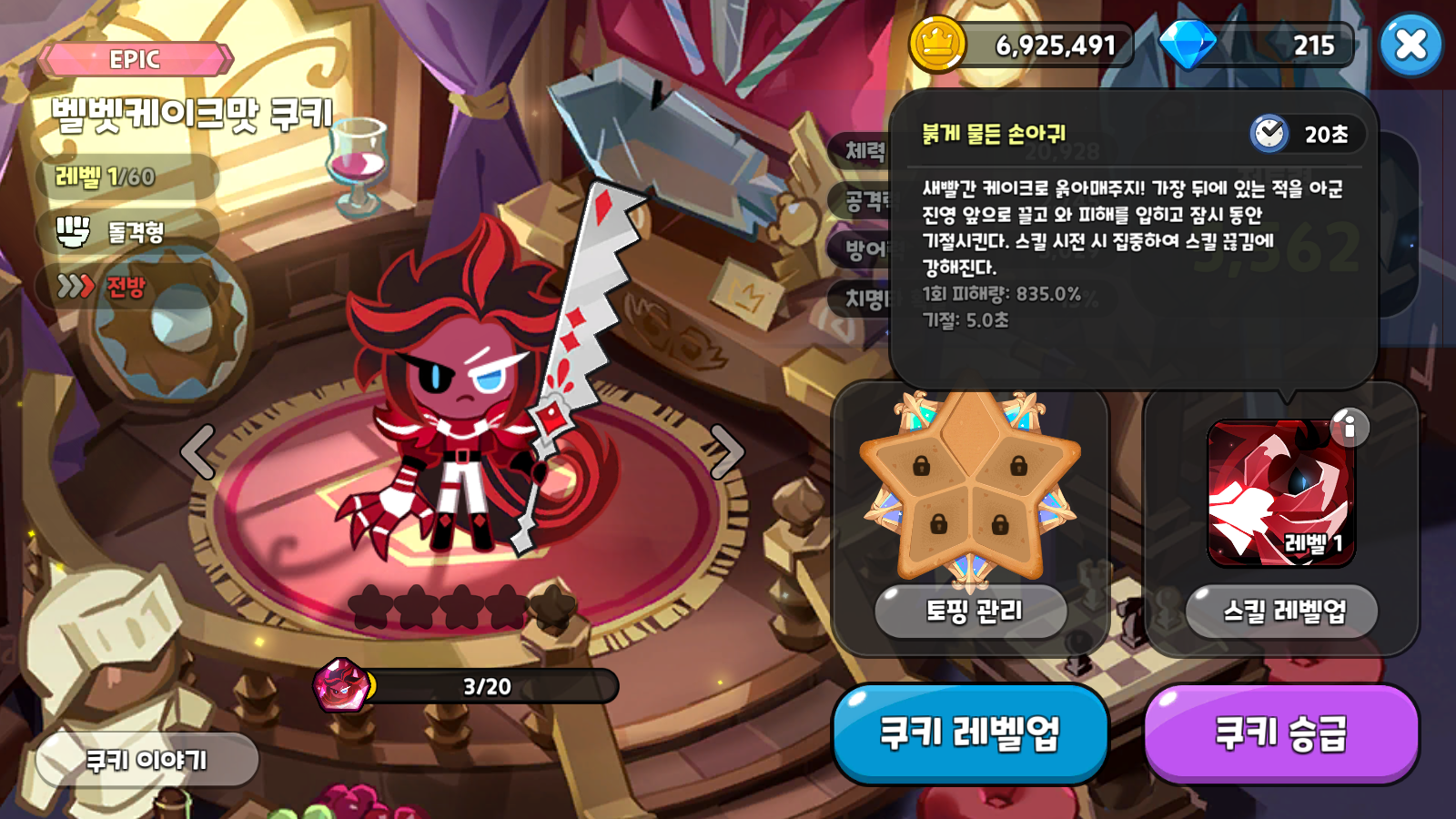 따라서, 내가 평가하기에는 다소 애매한 이 쿠키의 티어를 1.5등급으로 점수를 주고 싶다. 전방에 위치하는 만큼 피해감소 세팅이 필요해서 토핑작이 다소 번거로운 경우도 있다. 쿨타임 같은 경우에도 8.4% 이상을 맞추면 시작 쿨이 5초로 줄어든다.