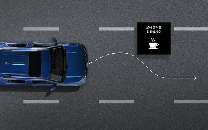주행 시 방향지시등 스위치의 움직임 없이 차로 이탈을 감지하면 경고를 해주고, 차로를 이탈하지 않도록 자동으로 조향을 도와줍니다.