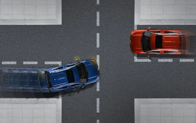 교차로에서 방향지시등 스위치를 아래로 움직이고 좌회전 시 인접 차로에서 다가오는 차량과의 충돌 위험을 감지하면 경고를 해주고, 경고 후에도 충돌 위험이 높아지면 자동으로 제동을 도와줍니다.