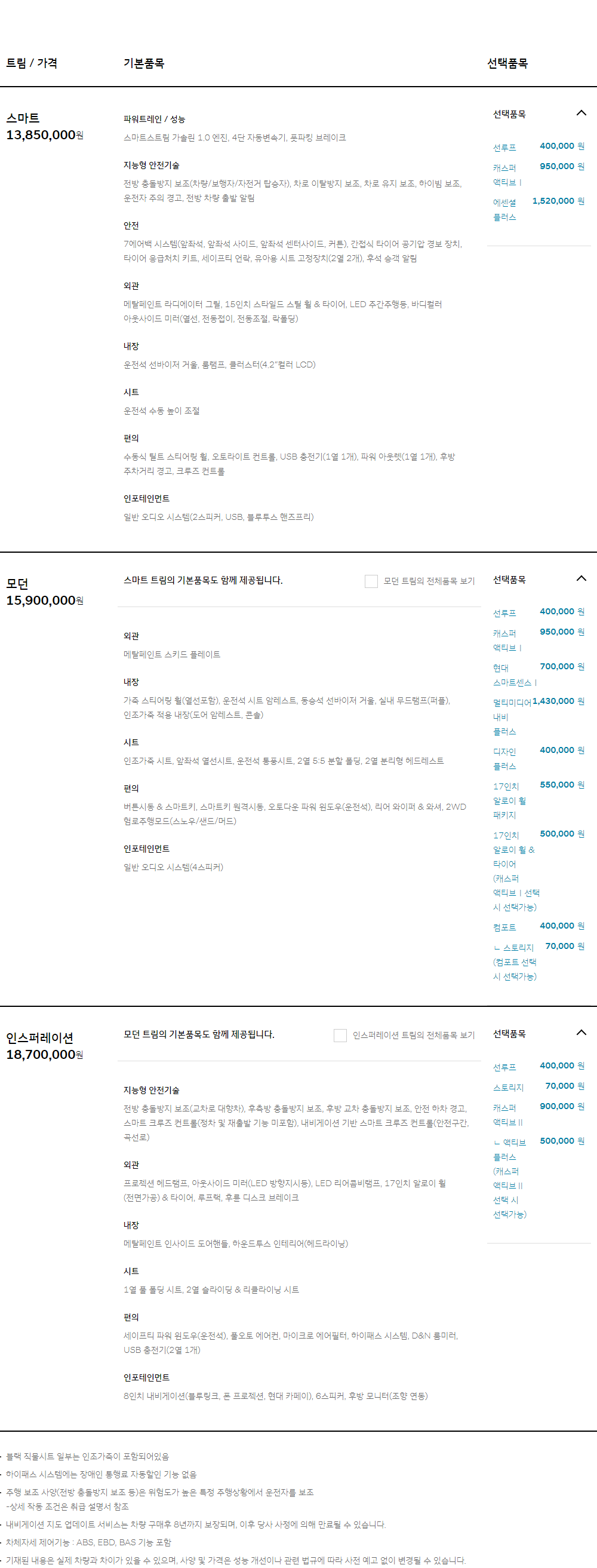 현대 캐스퍼의 전체 가격표다. 솔직히 말해, 깜짝 놀랐다. 이런 가성비는 처음 봤다. 현대 캐스퍼가 사람들의 이목을 끄는 이유가 바로 이 점이 아닐까 싶었다. SUV 경형(경차)로 나와 2천 만원 이하의 가격대라면 정말 착한 가격대가 아닌가 생각이 들었다. 솔직히 말해서 위의 부분들에 대해 어느정도 부정적인 평가를 내린 점들이 있는데, 그럼에도 불구하고 이 가격대라면 굉장히 훌륭하게 잘 아논 것이 아닌가 하는 생각이 들었다.