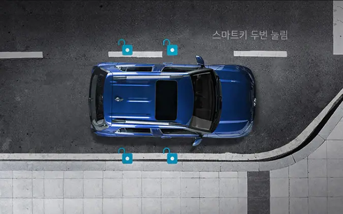 스마트키나 운전석 도어 바깥 손잡이에 있는 도어 잠금 해제 버튼을 1회 작동 시 운전석만 열리고, 4초 이내에 다시 한번 도어 잠금 해제 버튼을 누를 시 모든 좌석이 오픈되는 기능으로 차량 범죄 예방 효과가 있습니다.