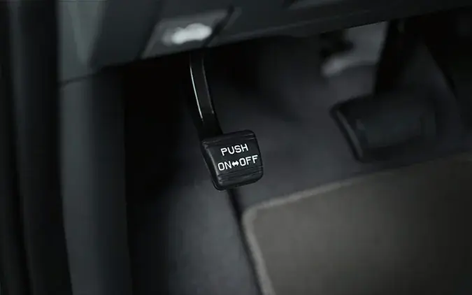 주차 시 사용하는 브레이크 장치로 운전석 좌측 아래 풋레스트 위에 배치되어 발로 밟아서 조작하는 제동장치입니다. 해제 시에는 다시 한 번 더 세게 눌러 브레이크 시스템을 해제합니다. 브레이크가 작동하지 않는 위급상황에서 주차 브레이크를 사용할 수 있습니다. 그러나 제동거리는 정상적인 제동거리보다 더욱 길어집니다.